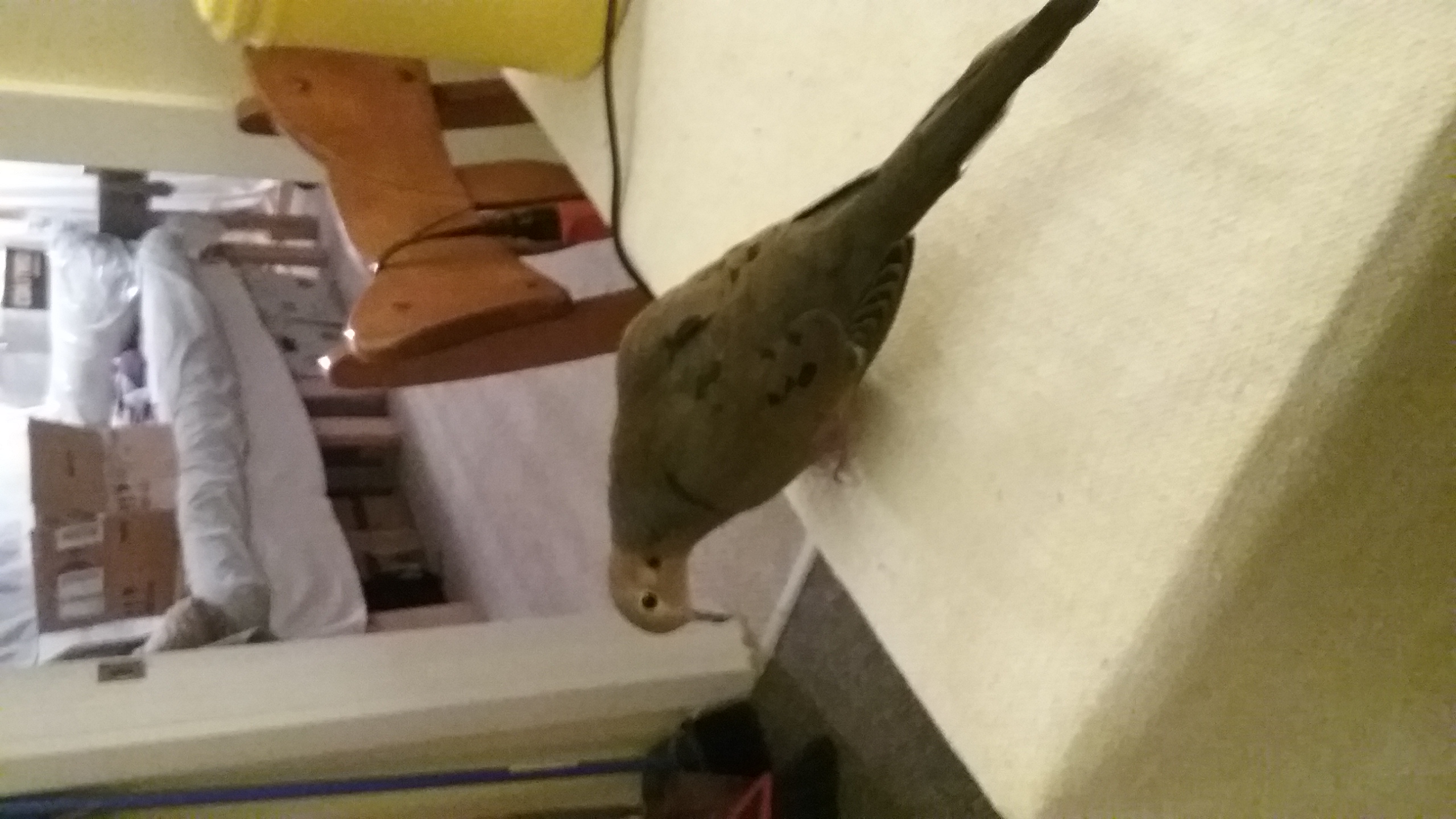 He doesn't seem to mind OUR companionship at all. In fact, he truly appears to enjoy our “contact” and “together time”. But I've no doubt that the company of another dove would be more appropriate and perhaps, more appreciated. I have a LOT of searching and researching to do now. Still, it truly was a most remarkable experience to see! (And now I know I'll have to keep those pillows on the futon... with the beige covers!) All said, the matter didn't last long and in no time, the moment I started moving about the room, he was back to chasing me! And we had several games of it too!