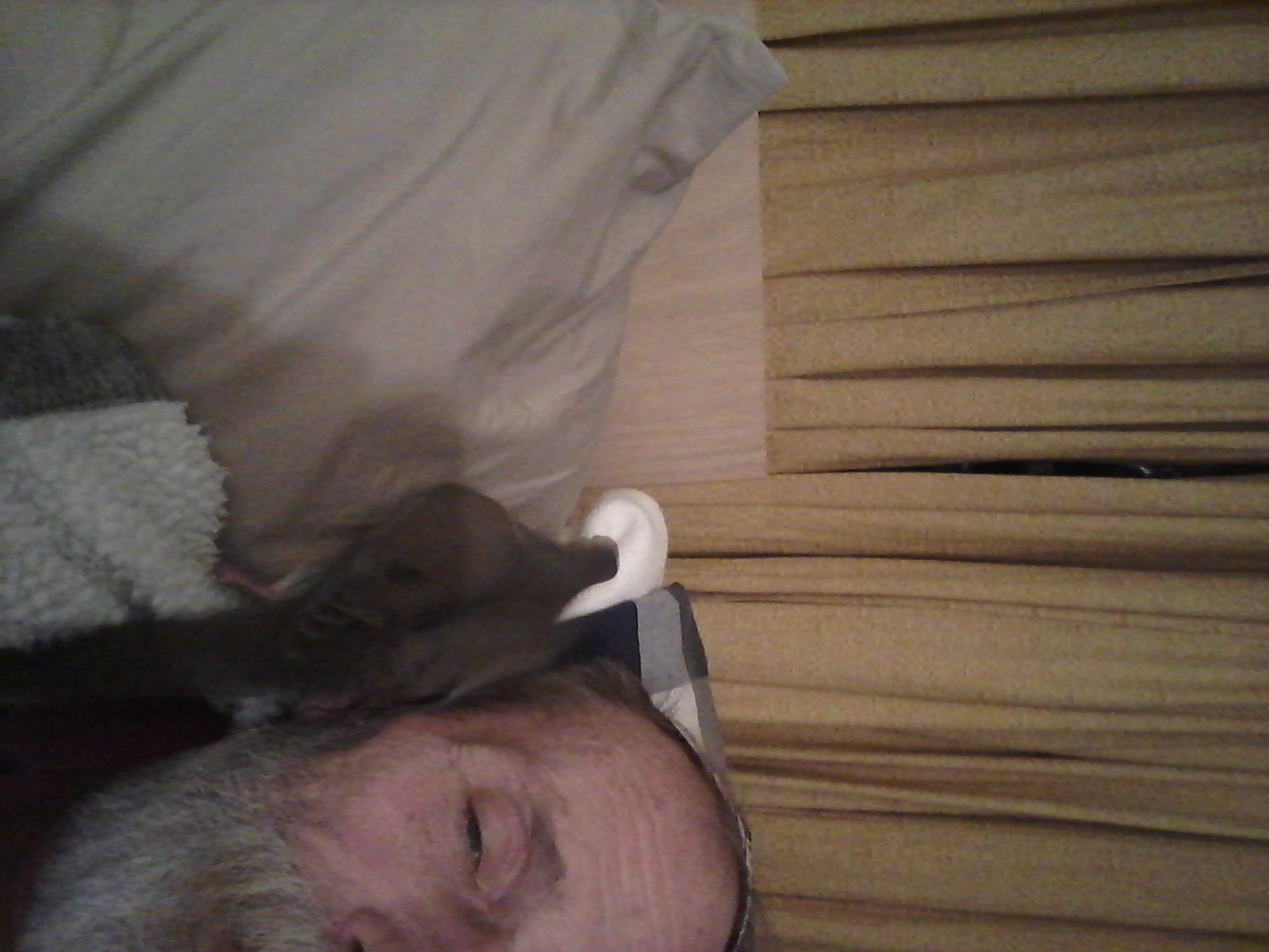 I dozed-off for about 10 minutes and when I woke... THERE HE WAS, ON THE PILLOW, AT MY FORE-HEAD, JUST SETTLED... RIGHT THERE! HE HAD A BIT OF A SNOOZE WITH ME AGAIN TODAY! HE'S REALLY THAT COMFORTABLE WITH AND AROUND ME! WHAT'S EVEN MORE... I WAS IN A “CLOWNING AROUND” MOOD AND HE SEEMED A BIT ON THE “FEISTY” SIDE SO, I REACHED UP AND BROUGHT HIM TO MY CHEST AS I LAID THERE, AND BROUGHT THE BLANKET OVER HIM, WITH MY HEAD UNDER SO THAT I COULD SEE HIM... JUST IN CASE HE APPEARED FRIGHTENED... HE DIDN'T MOVE! HE DIDN'T PANIC! HE DIDN'T EVEN SEEM TO MIND AT ALL! SO I LIFTED THE BLANKET UP BY MY HEAD, SO THAT HE HAD AN OPENING AND... EVERY-SO GRADUALLY... HE MADE HIS WAY UP TO THE BOTTOM OF THE PILLOW AND THEN UP TO THE “OPENING” AND OUT ONTO THE PILLOW WHERE HE STOOD, ALMOST LOOKING AT ME AS IF SAYING “HAVE YOU LOST YOUR MIND?” THERE WASN'T EVEN THE SLIGHTEST INDICATION OF “FRIGHT” AT ALL! HE TRUSTS ME THAT MUCH!