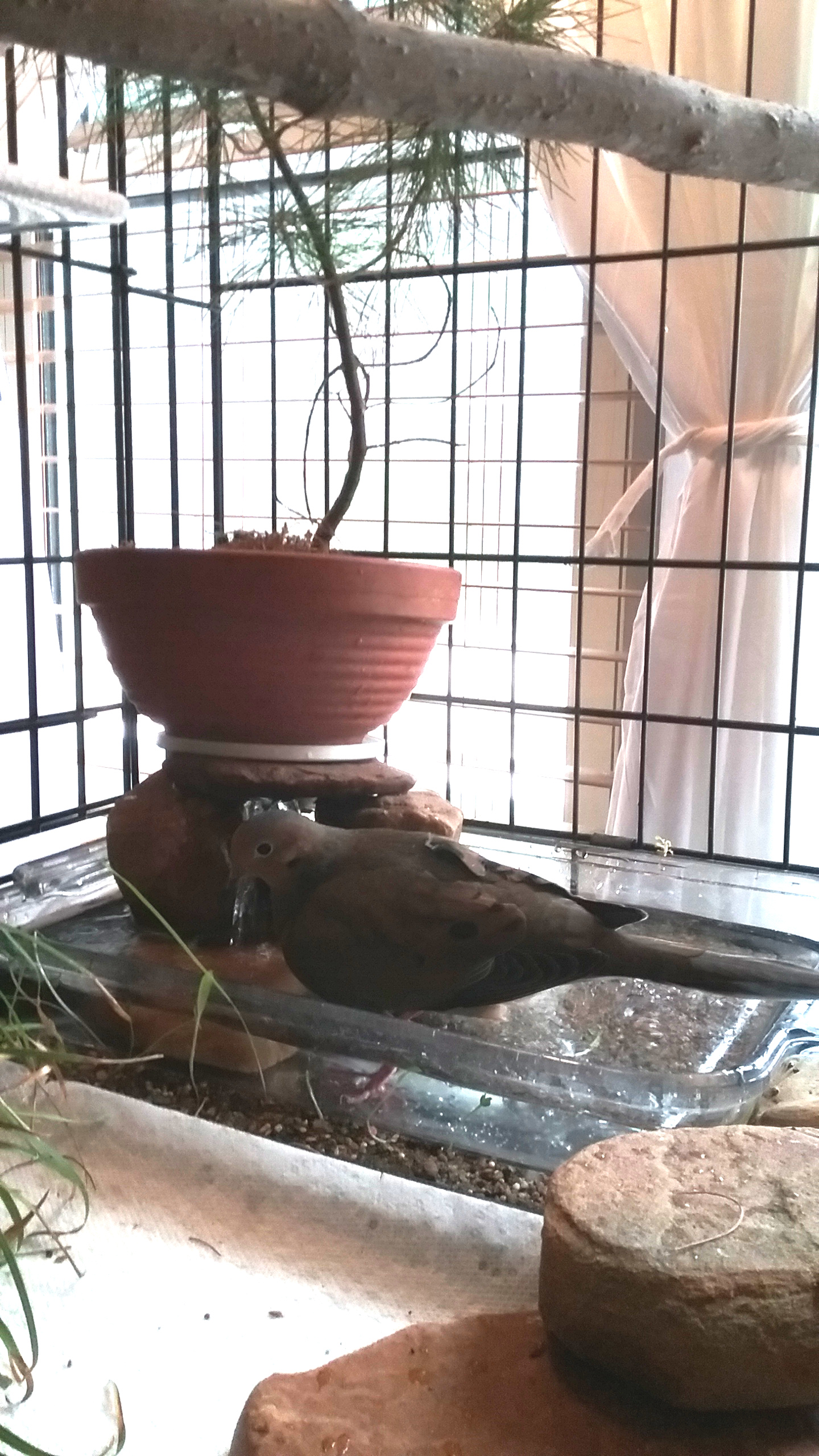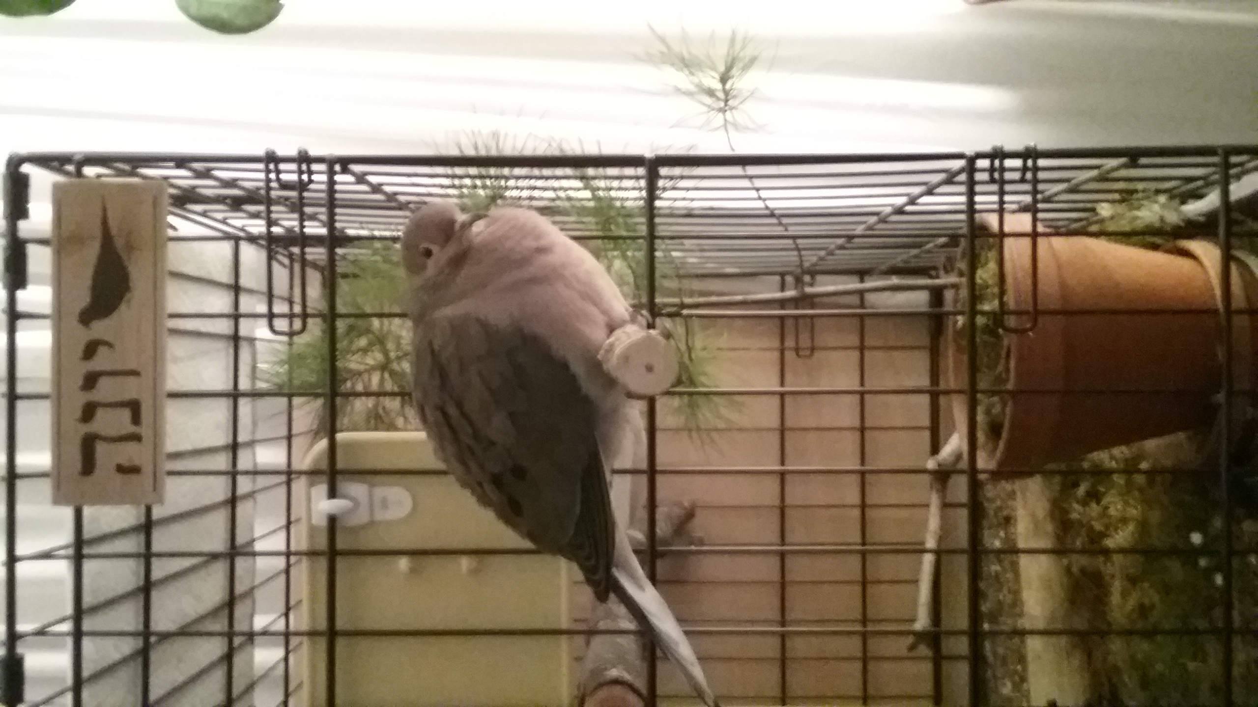 I HAVE been considering, as I've already mentioned, getting him a companion. I see now that I ought to be looking at a female. And yet, I still wonder how Yonah would take to “sharing” his “house and home”, be it with another male or a female. I would be devastated if the presence of another mourning dove, or ANY other dove, would cause anxieties... for Yonah OR for the other dove! And now I see I really have to seriously consider finding another mourning dove for him! Oh... but this is going to be interesting.