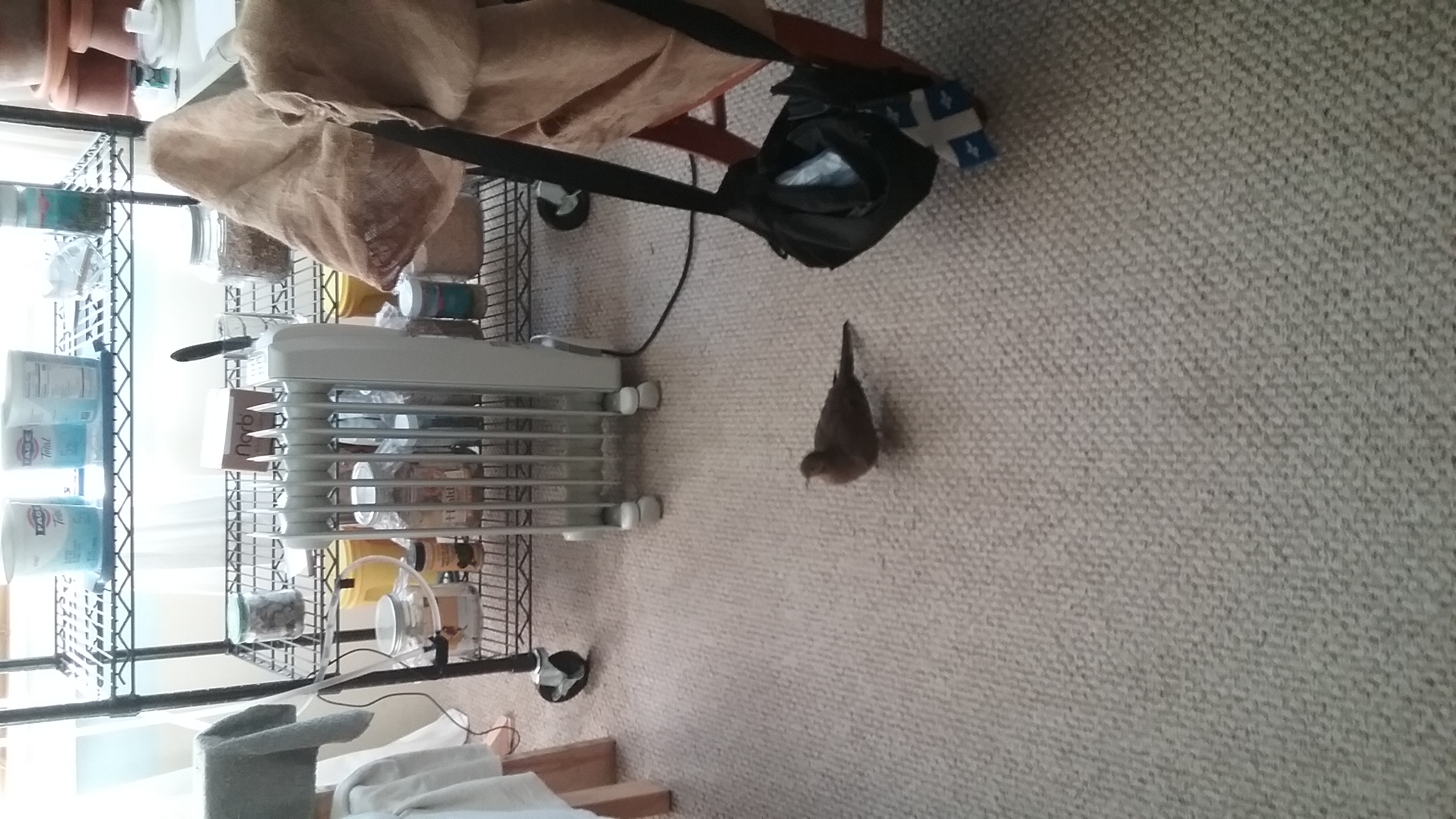 And Yonah's found a new “favourite” place of late: on the floor! He started to take to the floor about a week or so ago, and it was a bit of a “startle” to me because not only can he find the strangest little places to “get into” (all of which, to be sure, are quite safe because I've put his room together so that there's NOTHING that could cause him ANY harm, AND, his floor is carpeted and it's Hoovered EVERY DAY! At least once. So there's nothing in the carpeting that could harm him, like getting his toes caught or “finding something interesting to eat”), but his colouring is such that, aside from a pure-white back-ground, he CAN all but disappear into his surroundings! If he isn't in the middle of the room, several have been the times when I've stood there, absolutely bewildered, scanning every corner, every bit of furniture, not daring to move for fear of treading on him! And he's not the type to respond when called, either by name or by “coo”. Instead, he stands where he is and simply looks, as if he's thinking “What's wrong with you? I'm right HERE!” (I've already mentioned how he also finds it “comfy”, if I can call it that, to be under the work table as I work... by my feet, or behind the chair where I sit... thankfully, it's not on wheels. So now, when-ever I want to change the position of my feet or legs, I have to take a “scan” under the table, under the chair and behind and beside me. Sometimes, he reminds me of a precocious kitten, to be honest.) What intrigues me though is, the floor is noticeably cooler than the rest of the room, and certainly cooler than Yonah's house, which is raised a meter up (39 inches), at full-window level, and he has the small, electric radiator below and in front so the warmth rises to him, yet, he decidedly prefers to spend his time wandering about in the coolness! And he's not “fluffed”, so, the temperature “down there” is quite agreeable. Still, I do my best to keep his room above 20° (68°F) and, for the most part, it's usually 21° (70°F). But, he chooses the floor and since he's in no danger there, and he knows he doesn't HAVE to be there, well, the entire house is his now, he's entitled to be where-ever he feels comfortable. (I still do my best to maintain a “warm” place for him, and to be honest about it, when he wants warmth, he DOES enjoy a “roost-and-sooze” on his door perch, right above the radiator where the warmth rises best. He KNOWS what he wants, and now, he KNOWS where to go to get it.)