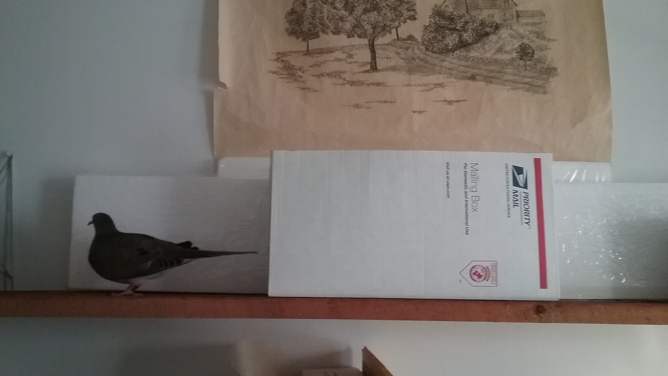 “Deb”, the neighbour down the road who recently has a beautiful white pigeon taking residence in her barns, has been SO helpful, in that she's giving me a list of places where she believes that, not only could they be beneficial to me in my searching for more information, but that, with this experience with Yonah over this year, the benefits could be mutual in that, I had constant, 24-hour companionship with Yonah and that, well, (of course), he's my “Life” and not just a limited number of hours occupation. I have much to look into in the coming days now and it would be a great comfort to be able to just ask questions of some-one who has a genuine interest in and caring for and about mourning doves. So I'm rather quite excited. And this “shelf habit” of Yonah's is one of my first questions. (Dear Reader, watch the “Care” pages... anything I learn will be posted there... including this “shelf affair”.)