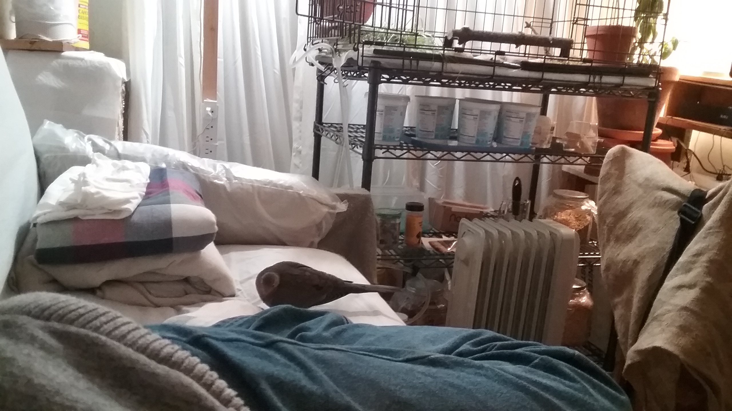 I got to my own “morning routine” whilst Yonah listened to his bird-songs and enjoyed the light of his NatSpec. In his room, the light was bright, the birds were chirping and coo'ing and it was delightfully warm and comfy. And Yonah? He “lounged” and took several flights about the place. Good exercise, those flights.
