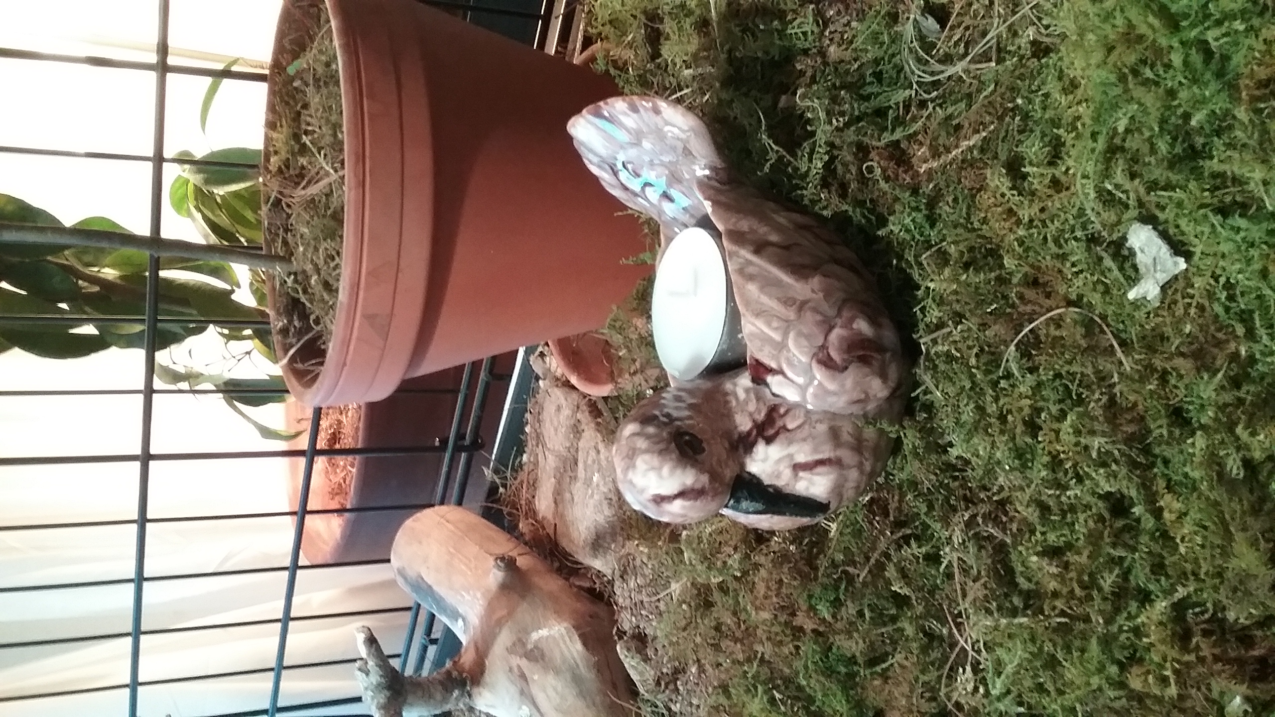And as for his little “house”, looking back at the few photos from then, it was so stark, sparse. I'd done the best I could, the best I thought necessary for his comfort and best health. But, compared to today, a year later, it was “sufficient” and that's about all. TODAY, his house is more like a little piece of the mountains, with little trees, mosses, a “sandy beach” to lounge in after a dip in the “pool” where the water trickles over rocks taken from the local river.