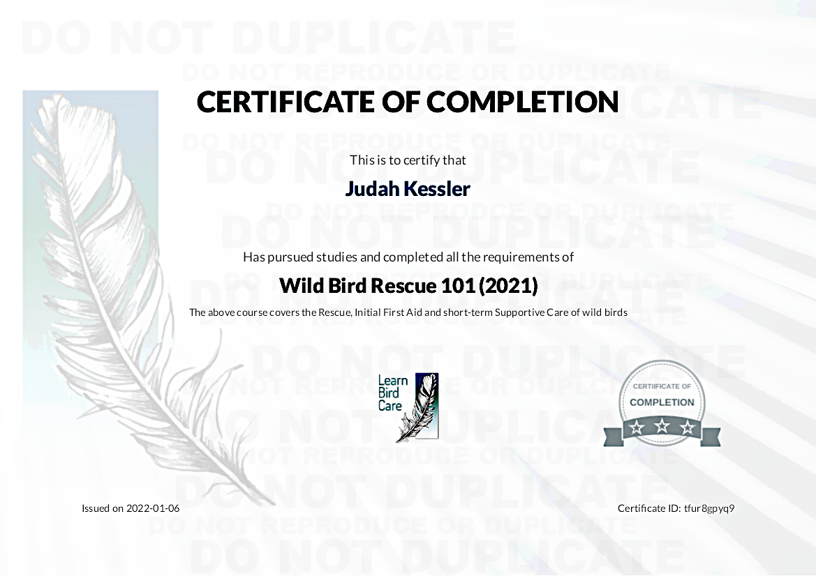 Thursday 06 January: ”CERTIFIED: AVIAN RESCUE, FIRST AID, CARE”