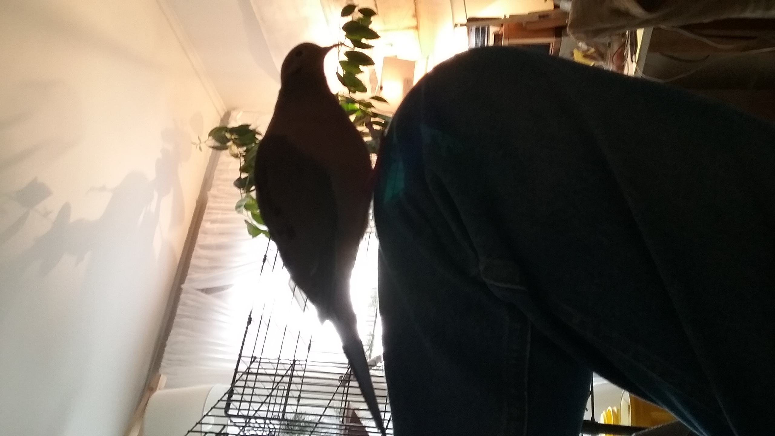 Sadly (for me), today, I had to make a run into market and again, this morning, I went into the living-room to put my boots on to head out the front door, hoping to exit un-detected and, no sooner had I sat down to lace than... FLUTTER WHISTLE WOOSH! There he was... I don't know HOW, and I know I never will, but even though I don't say anything about leaving, and I get my things together out of his line of sight, he KNOWS! He came out to the living-room and perched with the decoys on the limb there and watched me. And I tried to make my “excuses” and explain that I wouldn't be going out if I didn't absolutely have to (and that's true). When, so it seemed, I'd given sufficient cause for going, Yonah took off and went back into his room... and I hurried on my way. I wasn't gone but 35 minutes, total and when I got back? I called from the front door as I entered and, from across the house... “woo-HOO-hoo-hoo-hoo”, which is better than a “woo-HOO!” (or so I tell my-self). When I stepped into Yonah's room, he hopped down from the nest box on his ledge, hopped up onto the door perch and gave me a wing-snap! (CUDDLE TIME!)