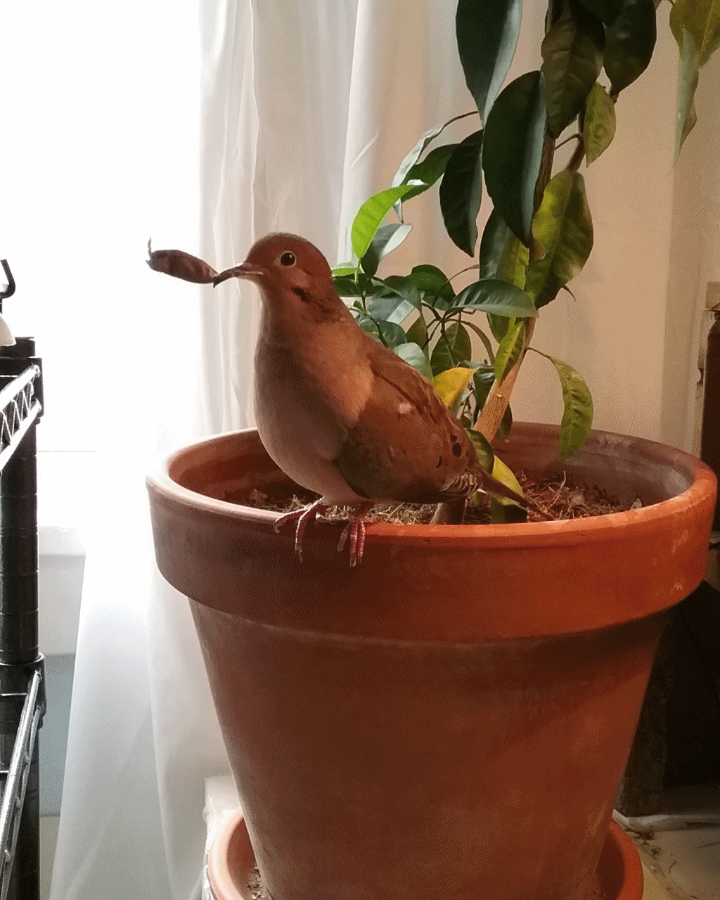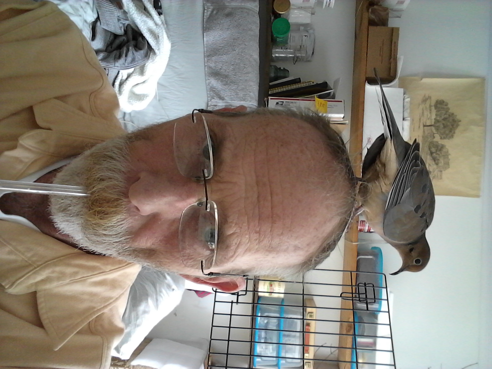 Now, I did go to the work table and no sooner had I sat down, Yonah was on my head, then on my shoulder, pecking at my ear. I leaned my head over toward him, he “nestled” into me for a moment and then... up and off and back to his house... He was “gardening” this morning.