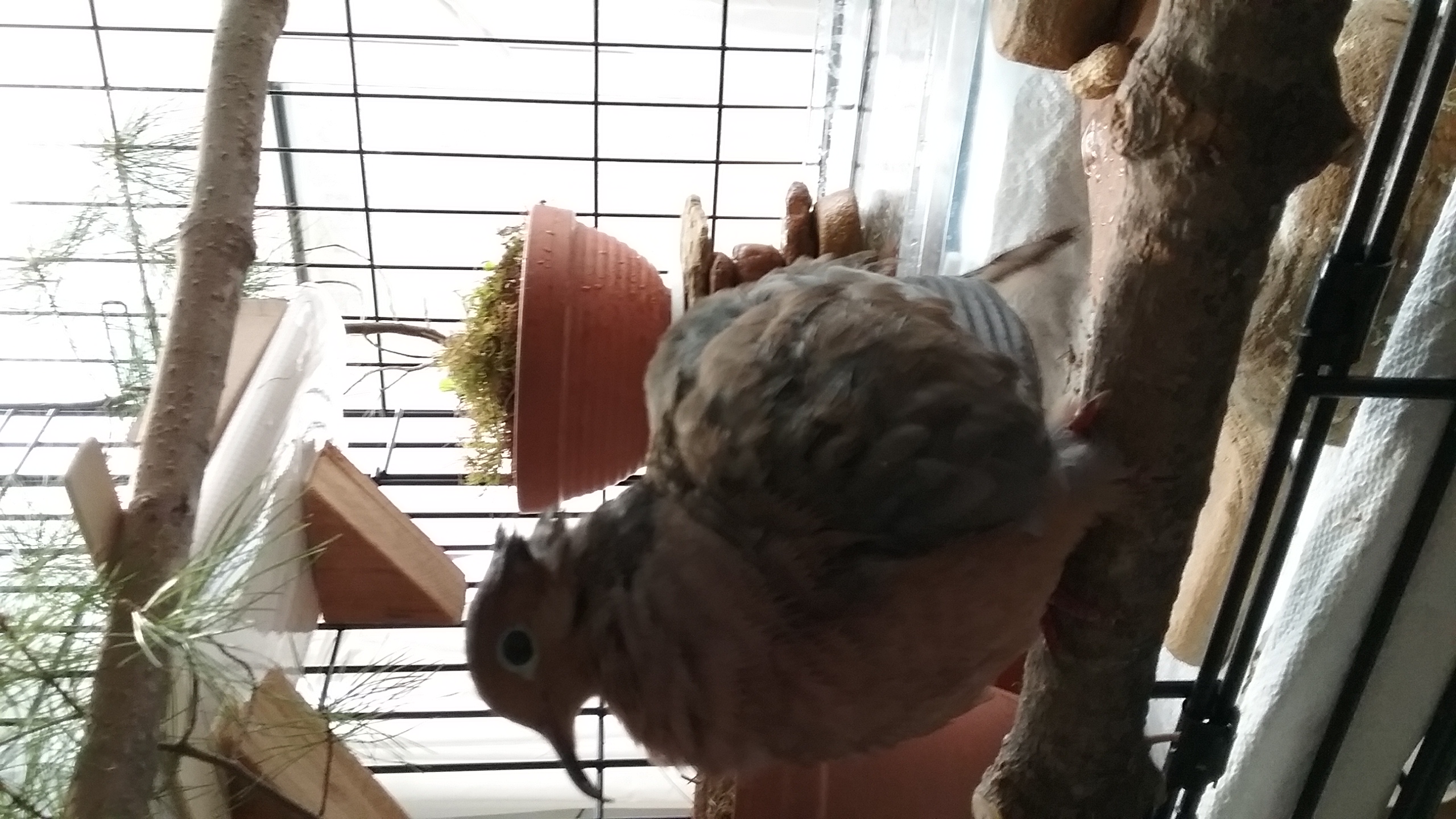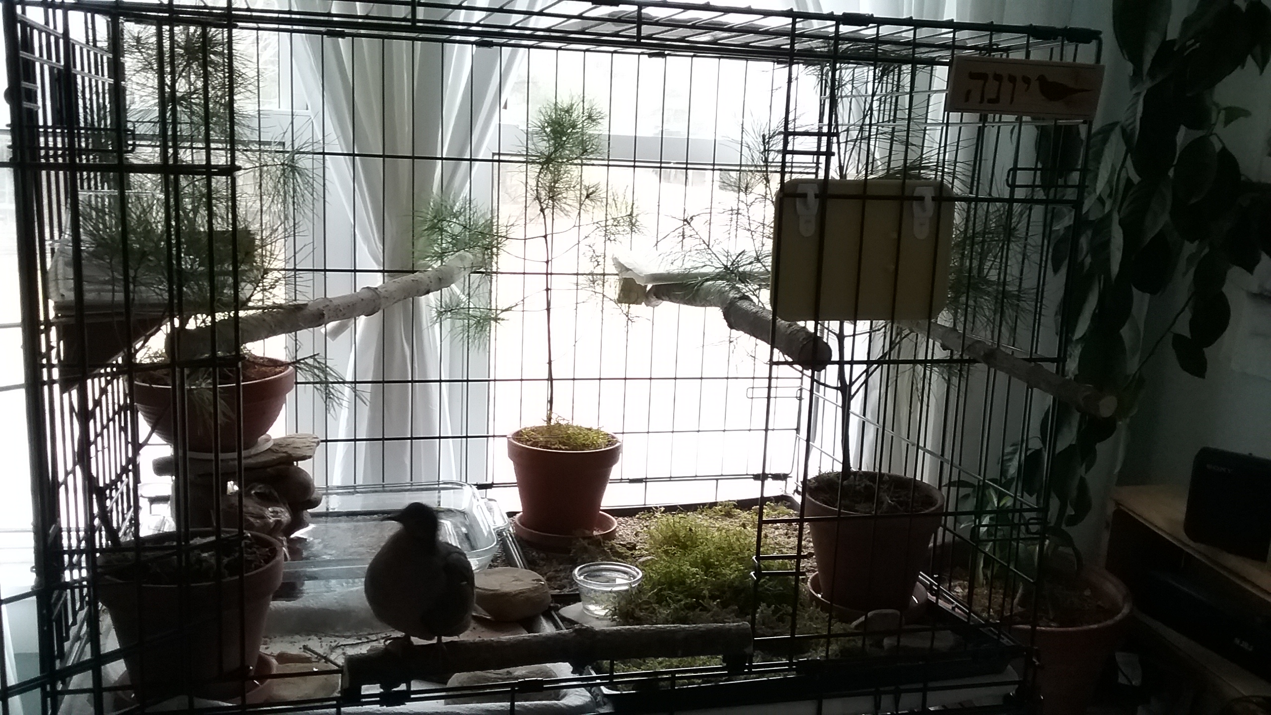 When windows were open, the light of the early morning filling his room, I could see that Yonah was, quite honestly, no different this morning from any other morning. Why he was down on his floor was to remain a mystery. But... he was just fine. And I was RELIEVED BEYOND DESCRIPTION! I said “woo-HOO-hoo-hoo-hoo”... he answered “woo-HOO-hoo-hoo-hoo” and we chatted as I got to the morning 'water relay”... which Yonah “supervised” from inside his house this morning, where he had a bit of breakfast as I worked... HE HAD BREAKFAST! HE WAS HUNGRY, HAD APPETITE.. WAS EATING! OK!