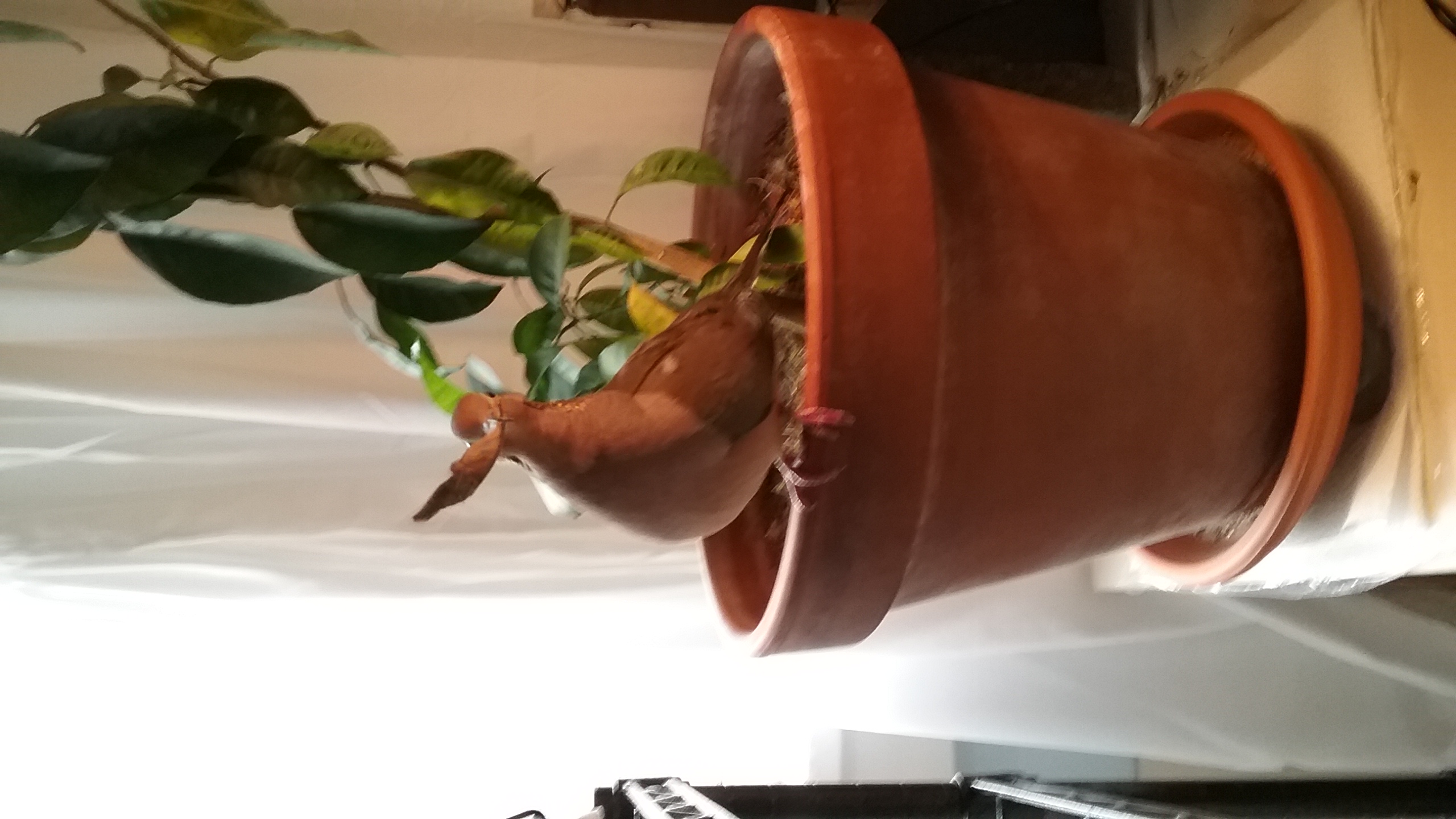 After we'd both “settled down and settled in” for the morning hours, Yonah headed to his roof-top and I set to working on moving his orange tree (it HAD to be moved... there are so many new branches coming in this season that it's touching the ceiling... AND, there are new branches coming in at the bottom where Yonah likes to “hide away”... it needed more space). OH! But as soon as I moved the tree, to re-position it, Yonah was right there, at the edge of the pot, as if to “check the positioning”. I HAD to laugh! But once he saw that it was simply being lowered, the little pots under the main pot being removed, it appeared that all was “approved”. Yonah took a “once round” the tree and then headed out of the room... and off into the living-room.