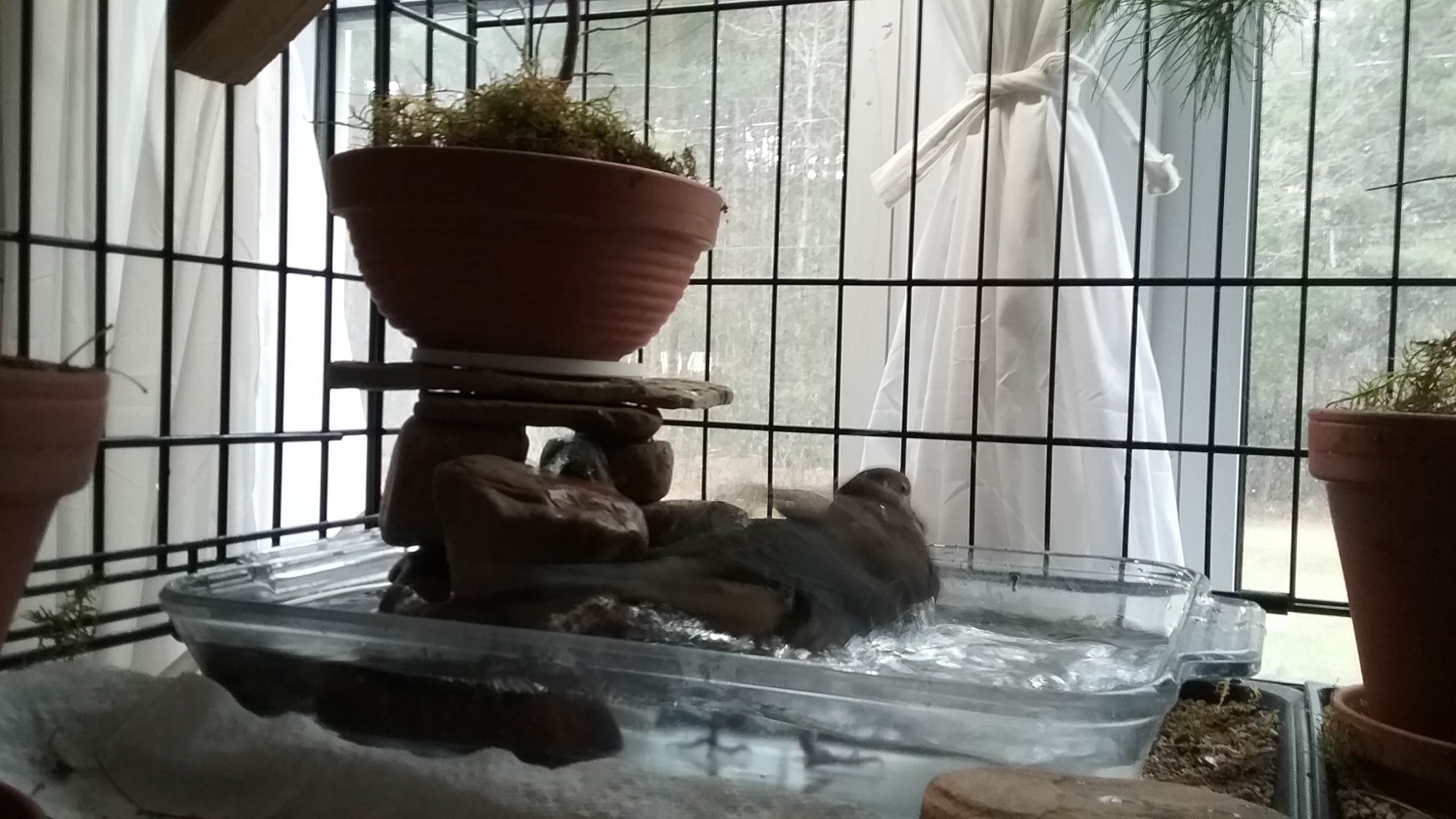 When Yonah had had enough of the “play”, we got to the “evening water relay” and tonight's took a bit longer because a tiny bit of moss managed to get caught in the tubing for his fountain. I have to do something to make sure that that doesn't happen again and so, we have a little something to work on over our week-end. I don't want to use metal window screening with all the water, and I'm not comfortable with the “plastic” screening that's so popular these days. So, we'll have to think of something and see what we come up with. But for this evening, Yonah didn't seem at all too pleased with the extra time I was taking. He was visibly some-what annoyed with me, mucking about with his fountain and pool. But we got it done... the water got completely changed twice too so tonight he has REALLY fresh, clean water there.