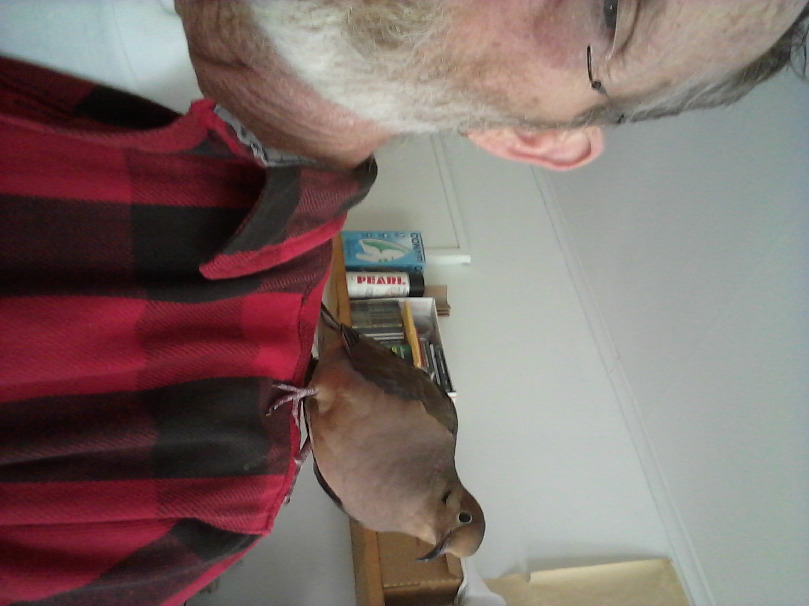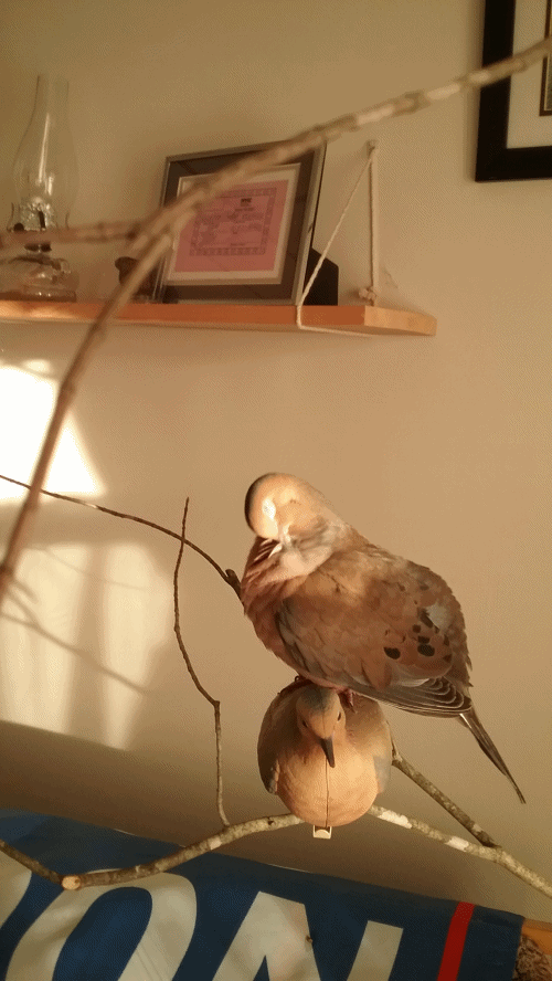 Later, this morning as well, I was working out-side the house, out-side Yonah's window, and ALL the while, we “chatted”... He coo'ing out through his open window and me coo'ing back. Honestly... “conversation”! And when I came back into the house, he was there, at the front door, waiting for me to come in! The in-side door was open, the screen was on the latch, of course. But it was a bit of a pleasant surprise to see him there. And as I made my way to his room, he FOLLOWED me... on the floor, toddling along. (It's really quite precious to see, but it makes walking a challenge because he darts... away from and back toward my feet!). And when we got into his room, he came FLYING up to my shoulder to give me some pulls on the ear and pecks on the cheek. Yes, he DOES notice when he's in the house alone... and he doesn't like it at all... and he makes it really quite obvious. People, in general, ought to know this. Maybe they'd see mourning doves for the sentient, cognizant little beings that they actually are. There's a LOT of information on the internet about parrots needing COMPANIONSHIP but I see precious little about doves, in general, on the matter. Never mind mourning doves... Then again, mourning doves aren't “pets”, and to be quite clear, I do NOT see, think of or feel that Yonah is a “pet”... in ANY fashion or manner. He's my “superior” in most ways, and, he is, as I refer to him, my “Heart-and-Soul”. (Though, knowing “people”, if most WERE made aware of the attachment mourning doves form with people, it wouldn't make any difference in their general disrespect for mourning doves... or any other Little Ones, for that matter, I've no doubt.)
