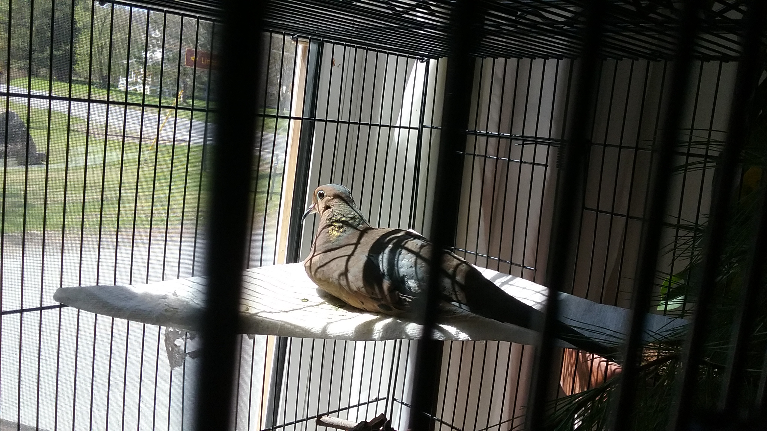 GLORIOUS SUN-SHINE today! And Yonah passed the day, basking, as it POURED in through her windows! And her “door” was open all day, but she didn't appear to be even slightly interested. I'm some-what fascinated because I would have expected her to try to some sort of “escape”. Obviously, she doesn't even feel “captivated”, and she's quite comfortable in her own space there. Well, I'm comforted by her comfort, although I'd like her to get out, get some “exercise” of those wings. Still, as long as she's content, that's my primary concern.