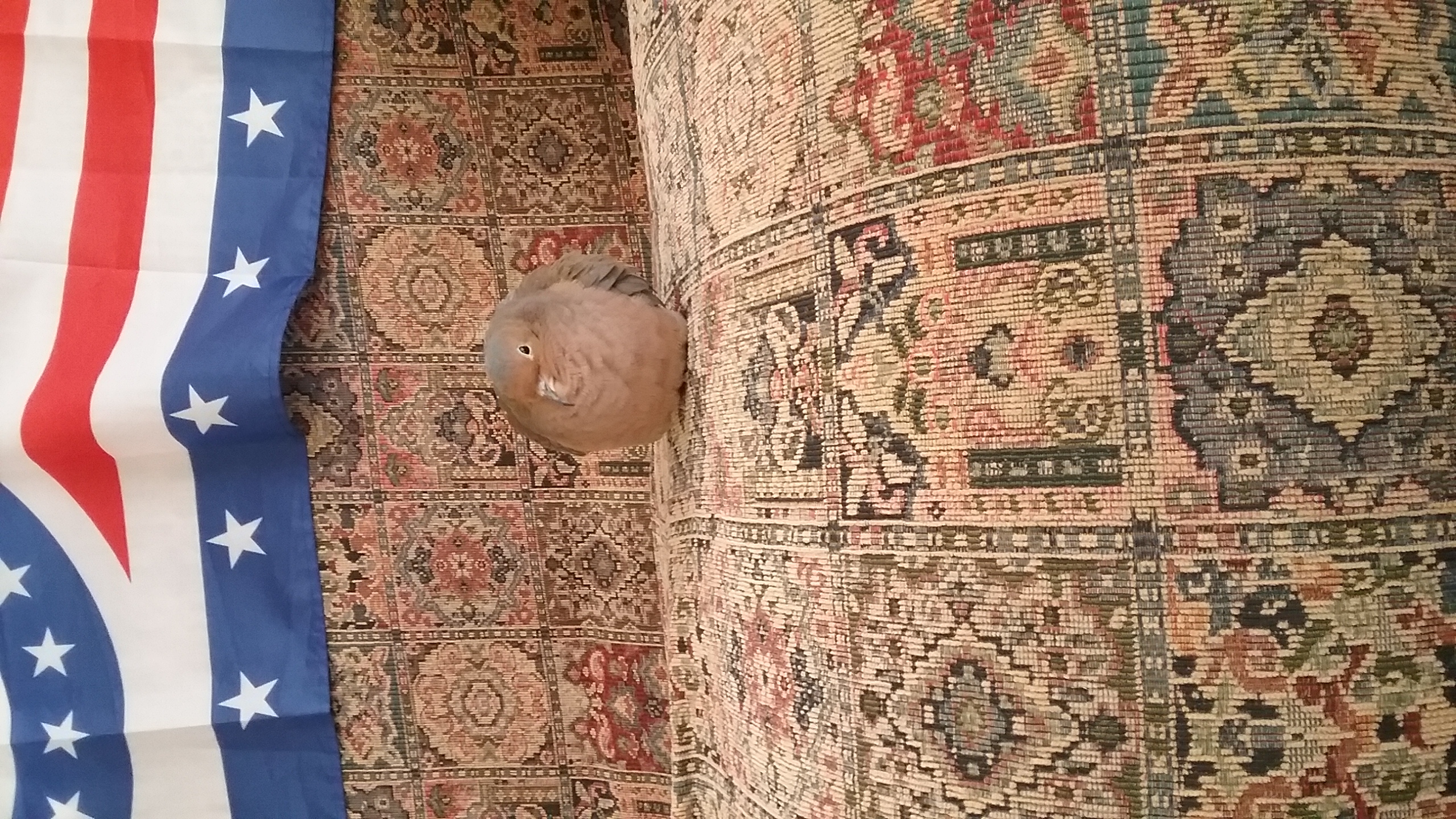 ***** THEN ***** AT 14.53, I WAS SNOOZING, ON THE FUTON, IN THE LIVING-ROOM. I HAD A 22-MINUTE ALARM SET FOR 14.55 WAKE-UP. I'D JUST STARTED COMING OUT OF MY LITTLE NAP WHEN, FROM YONA'S ROOM, I HEARD HER “CALL”, WOO-HOO-hoo-hoo, WHICH IS HER USUAL CALL. VERY SOON THERE-AFTER, AS I LAID THERE, EYES CLOSED, WAITING FOR THE ALARM, THE SOUND OF FLUTTERING WINGS... IN THE LIVING-ROOM !!! I OPENED MY EYES JUST IN TIME TO SEE YONAH FLY OVER ME AND THE ACROSS THE LIVING-ROOM TO THE LITTLE “ALCOVE” ACROSS FROM THE FUTON! SHE “LANDED” ON THE FLOOR BEHIND THE CHAIR THERE! SHE'D MADE THE “FLIGHT” FROM HER ROOM, THROUGH THE KITCHEN INTO AND ACROSS THE LIVING-ROOM AND BACK TOWARD THE KITCHEN! SADLY, SHE DIDN'T QUITE PROPERLY NAVIGATE THE OTHER END OF THE LIVING-ROOM AND HAD A BIT OF A “CRASH” INTO THE WALL... *** BUT NO DAMAGE, NO INJURIES *** !!! SO I GOT UP AND WENT OVER TO HER, ON THE FLOOR, AND TALKED ABOUT HER SUCCESSFUL FLIGHT. THEN, ASS I WENT TO PICK HER UP TO CHECK HER FOR INJURIES, SHE NESTLED INTO THE SPACE BETWEEN MY KNEES (I WAS ON THE FLOOR WITH HER) AND MY CHEST! I LET HER STAY THAT WAY A WHILE, AND THEN GOT HER ONTO MY ARM WHERE SHE STAYED, QUIETLY, FOR A BIT AS I WALKED AROUND THE LIVING-ROOM! WE WENT, TOGETHER, TO THE FUTON, WHERE I SAT WITH HER, ON MY ARM, AND TALKED A LITTLE WHILE LONGER. AFTER A WHILE, I STOOD UP AND MANAGED TO COAX HER TO MY SHOULDER WHERE SHE COULD BE MORE COMFORTABLE, AND I WALKED ROUND THE HOUSE WITH HER THERE, AND GOT TO TAKE SOME “SELFIES” OF THE WHOLE SITUATION! (I note: I look HORRID these days... so *OLD* and almost “decaying”... “selfies”... they won't become a habit, to be sure.) ANYWAY... WE WENT ROOM-TO-ROOM ABOUT THE HOUSE, TOGETHER, AND WHEN WE GOT BACK TO HER ROOM, SHE TOOK OFF FROM MY SHOULDER AND WENT TO THE TOP OF HER HOUSE WHERE SHE “PERCHED”, TAKING A REST FROM HER “ADVENTURE”! BUT... SHE WAS ON MY SHOULDER, MY NECK, LOOKING AT ME, PECKING AT THE BACK OF MY HEAD, MAKING HER TINY “COO'ING” SOUND... NOT, IN THE LEAST BIT, NERVOUS OR AFRAID! WELL !!! TODAY, Ms. YONAH HAS BEGUN HER “FLYING” !!! AND SHE DOES QUITE A GOOD JOB OF IT! SHE OBVIOUSLY NEEDS THE EXERCISE THOUGH... AFTER 6 MONTHS OF BEING IN THAT “HOUSE” OF HERS. BUT... TODAY IS MY “DREAM COME TRUE” !!! SHE'S OUT OF THAT HOUSE AND GETTING TO USE HER WINGS! DAY 1. THERE WILL BE MANY MORE TO COME NOW. (My precious little COMPANION is getting ready to... “leave the nest”, as it were. I AM EXCITED FOR HER! Honestly, I AM excited for her.)
