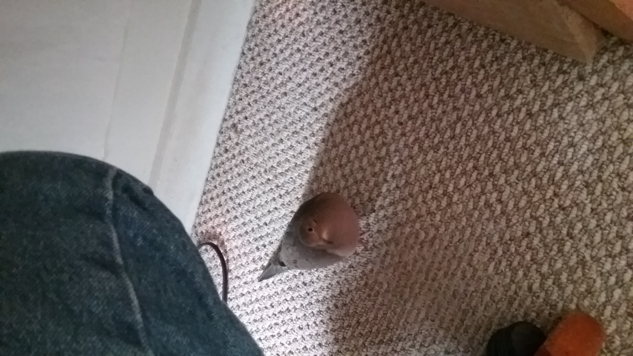 And Yonah's found a new “favourite” place of late: on the floor! He started to take to the floor about a week or so ago, and it was a bit of a “startle” to me because not only can he find the strangest little places to “get into” (all of which, to be sure, are quite safe because I've put his room together so that there's NOTHING that could cause him ANY harm, AND, his floor is carpeted and it's Hoovered EVERY DAY! At least once. So there's nothing in the carpeting that could harm him, like getting his toes caught or “finding something interesting to eat”), but his colouring is such that, aside from a pure-white back-ground, he CAN all but disappear into his surroundings! If he isn't in the middle of the room, several have been the times when I've stood there, absolutely bewildered, scanning every corner, every bit of furniture, not daring to move for fear of treading on him! And he's not the type to respond when called, either by name or by “coo”. Instead, he stands where he is and simply looks, as if he's thinking “What's wrong with you? I'm right HERE!” (I've already mentioned how he also finds it “comfy”, if I can call it that, to be under the work table as I work... by my feet, or behind the chair where I sit... thankfully, it's not on wheels. So now, when-ever I want to change the position of my feet or legs, I have to take a “scan” under the table, under the chair and behind and beside me. Sometimes, he reminds me of a precocious kitten, to be honest.) What intrigues me though is, the floor is noticeably cooler than the rest of the room, and certainly cooler than Yonah's house, which is raised a meter up (39 inches), at full-window level, and he has the small, electric radiator below and in front so the warmth rises to him, yet, he decidedly prefers to spend his time wandering about in the coolness! And he's not “fluffed”, so, the temperature “down there” is quite agreeable. Still, I do my best to keep his room above 20° (68°F) and, for the most part, it's usually 21° (70°F). But, he chooses the floor and since he's in no danger there, and he knows he doesn't HAVE to be there, well, the entire house is his now, he's entitled to be where-ever he feels comfortable. (I still do my best to maintain a “warm” place for him, and to be honest about it, when he wants warmth, he DOES enjoy a “roost-and-sooze” on his door perch, right above the radiator where the warmth rises best. He KNOWS what he wants, and now, he KNOWS where to go to get it.)