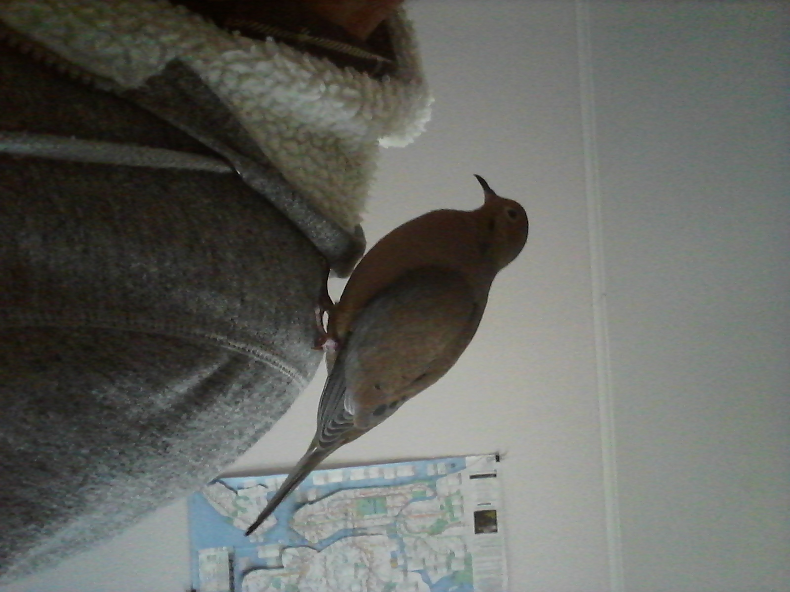 And the day? Well, we were, for the greatest part of it, together. Yonah watched me as I worked at little things in his room to make it more comfortable for him. One thing in particular was to put a filtration on the heat register. We have “forced air” and I often worry about what might come through those vents since the furnace is in the cellar and the cellar is a 200-year old “dirt” cellar. Also, the “grille” is set that it blows up-ward, but the floor in his room tends to become quite cold by mid-Winter, so I installed a bit of a “hood” directing the hot air toward the floor. This way, it travels across the cold floor before rising, warming the floor as well as the room. And all the while I worked on the floor, Yonah either watched from his roof-top, a vantage point he seems to enjoy most, and, from time-to-time, he came down to the futon and then joined me on the floor. OH! “Curiosity”? Who-ever said that cats are curious obviously never me a mourning dove. I can say from direct experience: Yonah's curiosity exceeds that of any cat I've ever met. Whether I'm at the work table typing, or writing, even changing the linens on his futon, he watches. And in more recent days, will “become part of” what-ever I happen to be doing. It's amazing, remarkable, fascinating! (And again, at the risk of being boringly repetitive... I bring in the matter of “sentience”. Yonah sees something going on, acknowledges the activity, and either watches intently or comes close enough to where he literally becomes part of the action. THAT isn't “instinct”... THAT is “thought”!)