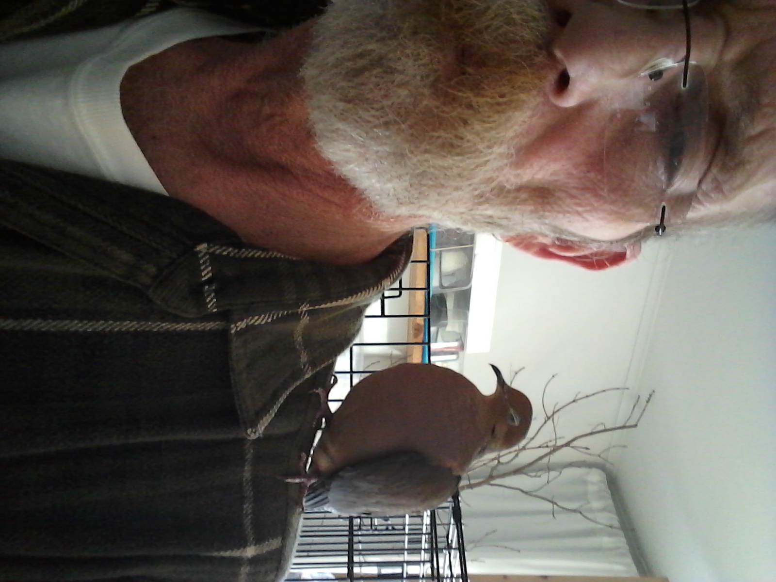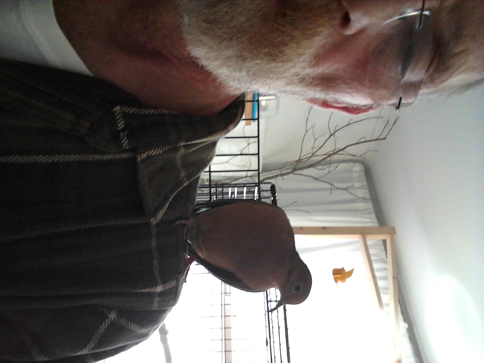 When I'd returned to the kitchen to finish my morning coffee and such, he “called” again, with his “woo-HOO-hoo-hoo-hoo-hoo...hoo-hoo”. It's that “longer” coo'ing that I've come to learn means he has something to “tell”. So I replied the same and... well... as I busied in the kitchen, we had what can only be rightfully called, a “conversation”. The coo'ing patterns changed now and then, but the exchange was almost non-stop. (I have to admit, I haven't the slightest idea what was being said, but the house was FULL of conversation this morning!) And when I'd done and come to settle for the day, at the work table, he came right to his door perch... WING-SNAP! AND WE CUDDLED! HE TRULY ENJOYS THE CLOSENESS, THE CONTACT!