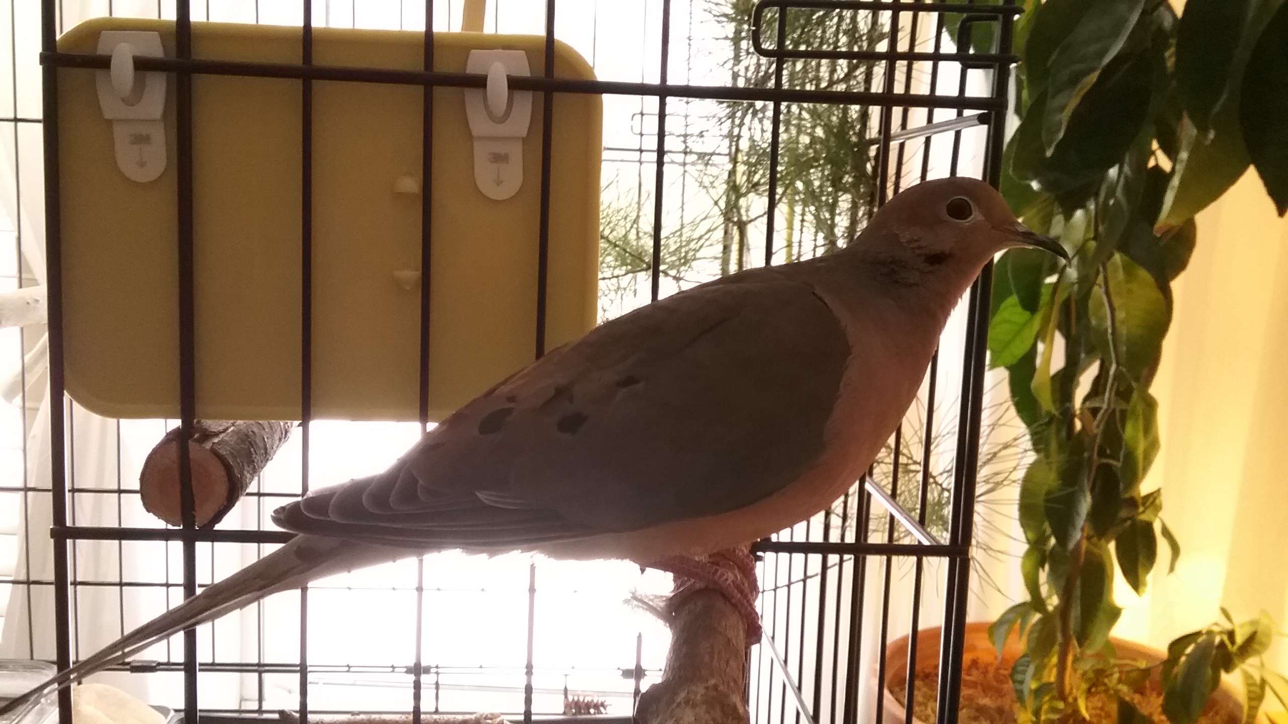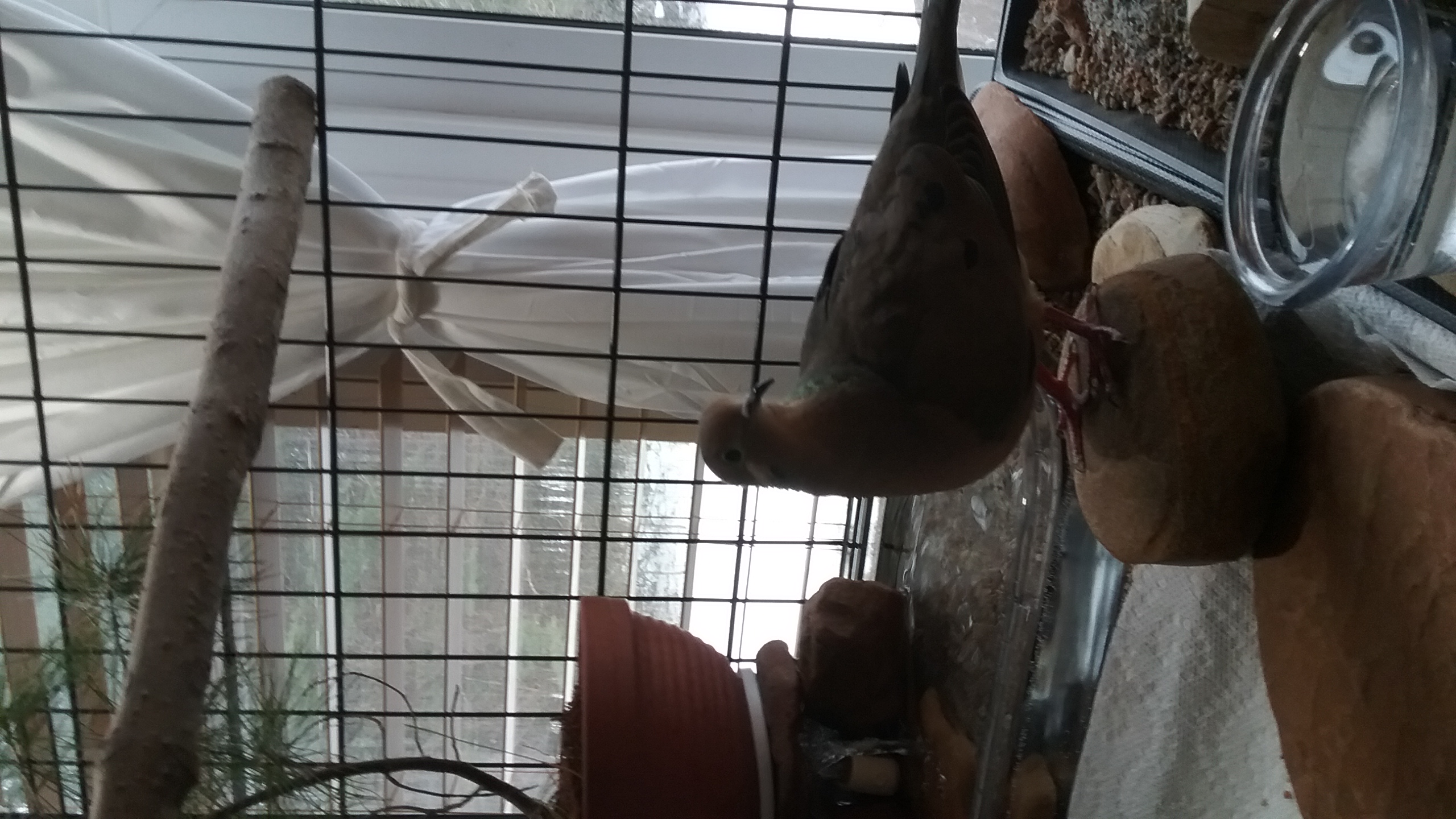 And of course, I see a mourning dove out in the yard and I think of a “companion” for Yonah... but, I'm not so sure he'd appreciate “sharing” his house and home with another... and I most seriously doubt another male would be a wise choice. “Competition” for space, house... and... affections. A fight for “dominance”. Oh well. There are perfectly legitimate “reasons” against such a thing. (Of course, if there are any “injuries” out there, it won't make any difference to me. I'm more than willing and able to provide separate quarters for “recovery”.