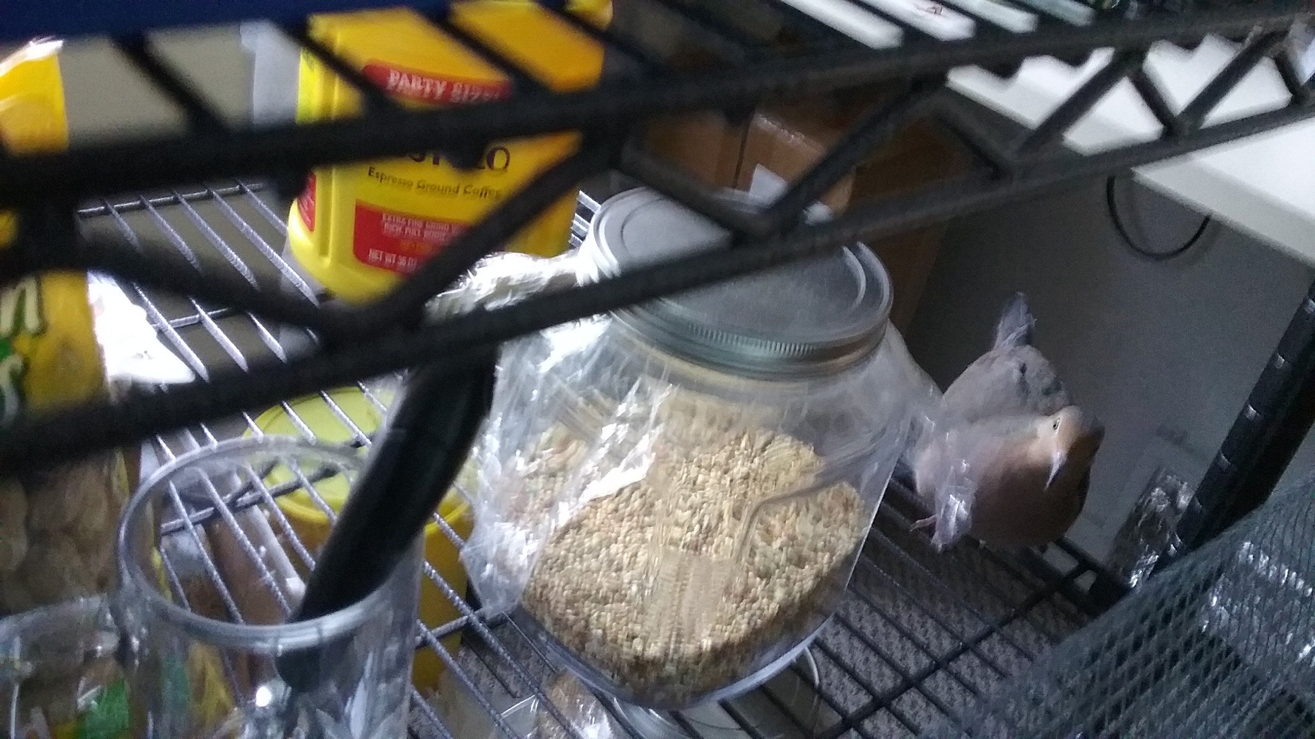 Once I'd located him, I sat on the floor to chat with him about what he's found, telling him what is in each of the jars and containers, and as I spoke, he continued walking along the shelving, in and out between the jars, looking into each one as he passed. He's seriously curious about SO much! I've read about parrots being “social”, “curious”, “affectionate”... I've read about doves (generally) being “interested in the goings-on” in a house-hold, and I've been in the company of curious cats and such, but Yonah is just making the rest look apathetic in comparison. (And I have to add: it's often the very same as having a curious, precocious little child in the house. I find myself arranging things so that he can't injure himself. I cover electric receptacles/outlets so he can't peck at them, and on the “power-bar/surge protectors” I have the un-used receptacles covered so that he can't step into them. It's the “smallest of things” that most people simply ignore or take for granted. But, as I say: Yonah is NOT a “caged pet”. This entire house is HIS domain and MY responsibility to to ensure his safety. And, it's a privilege to have this responsibility. I DO want him to be curious, to go through the house at will. Not only for his own entertainment and amusement, but for mine as well because it's a JOY to see him out and about, comfortably wandering. Were he out in the open world, there would be so much for him to explore! Limited as this house might be, there are no predators, and I make it certain that there are no “hazards” to his well-being.