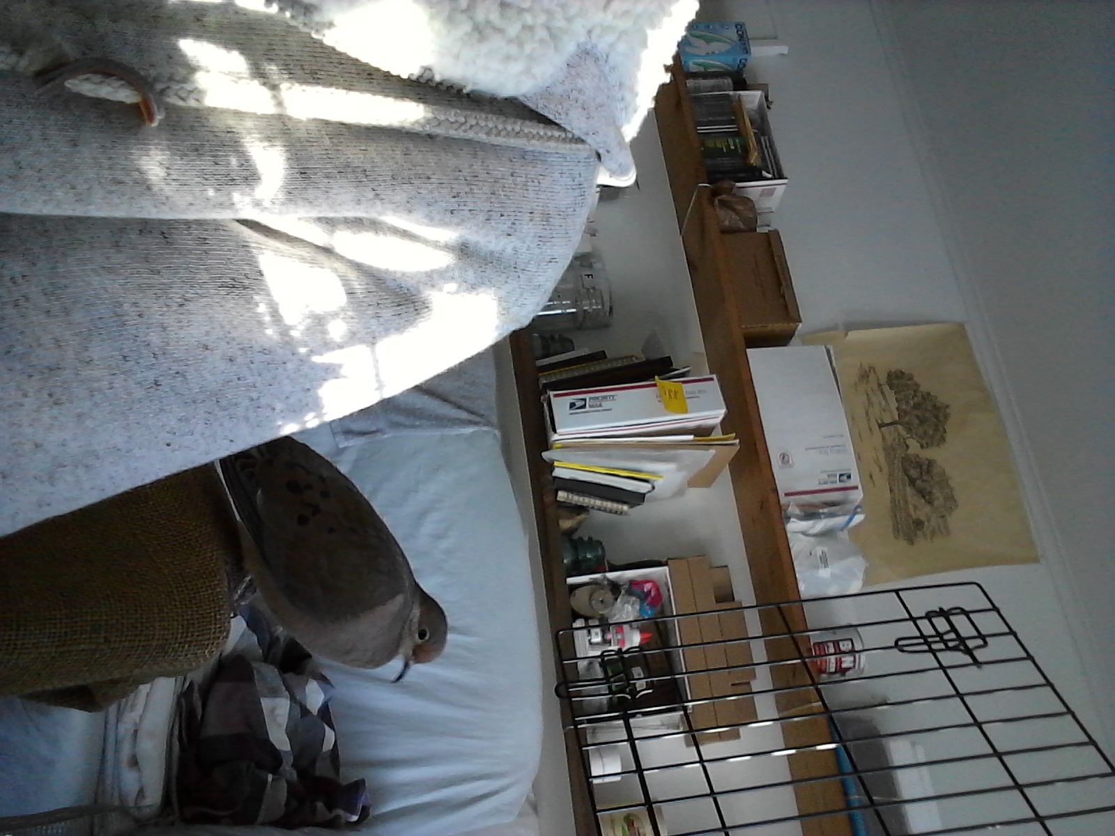 And our day went along, with me at the work table for a great part of it, both of us enjoying the brilliant sun-shine as it poured in through the windows. I took a “lunch break” and went into the kitchen to work more with the “Certification” lessons. (I don't use the WiFi in his room. Even with the allegedly “safer” “2G”, I just don't want to “attract” all those “waves” and such. I don't even bring the mobile phones in, unless there's a call I'm expecting. It might sound a bit “over-the-edge”, and I understand that, no matter where he is, and if he were out-side, there are those “waves and frequencies” and such, passing through... it's quite obvious when I check for my own WiFi and I see a signal from neighbours up and down the road... Still, I see NO reason or excuse to “attract” any more into Yonah's room. Just one of my many eccentricities, I suppose.) That said... I went to the kitchen where I had a coffee and lessons and, about 30 minutes later... “woo-HOO-hoo-hoo”! My little Bestie misses the company in his room... even though he'll ignore me for quite a while, when I'm not where I'm “supposed” to be... he calls! So I called back with a “woo-HOO-hoo-hoo”... he replied, I repeated... he didn't. Instead, I heard the “whistle of wings” and next thing I knew, he was on the end of his futon... where he could see and watch me in the kitchen! OK... BRILLIANT! (Now, imagine ALL mourning doves, EVERY-where, being this intelligent... and remember: they're the most-murdered... because some think it “sport”, “fun”, “amusement”, entertainment”... just to MURDER them.) To be sure, I finished the “module” I was working on and wrapped the lesson... and brought me back to where I was “supposed” to be... at the work table.