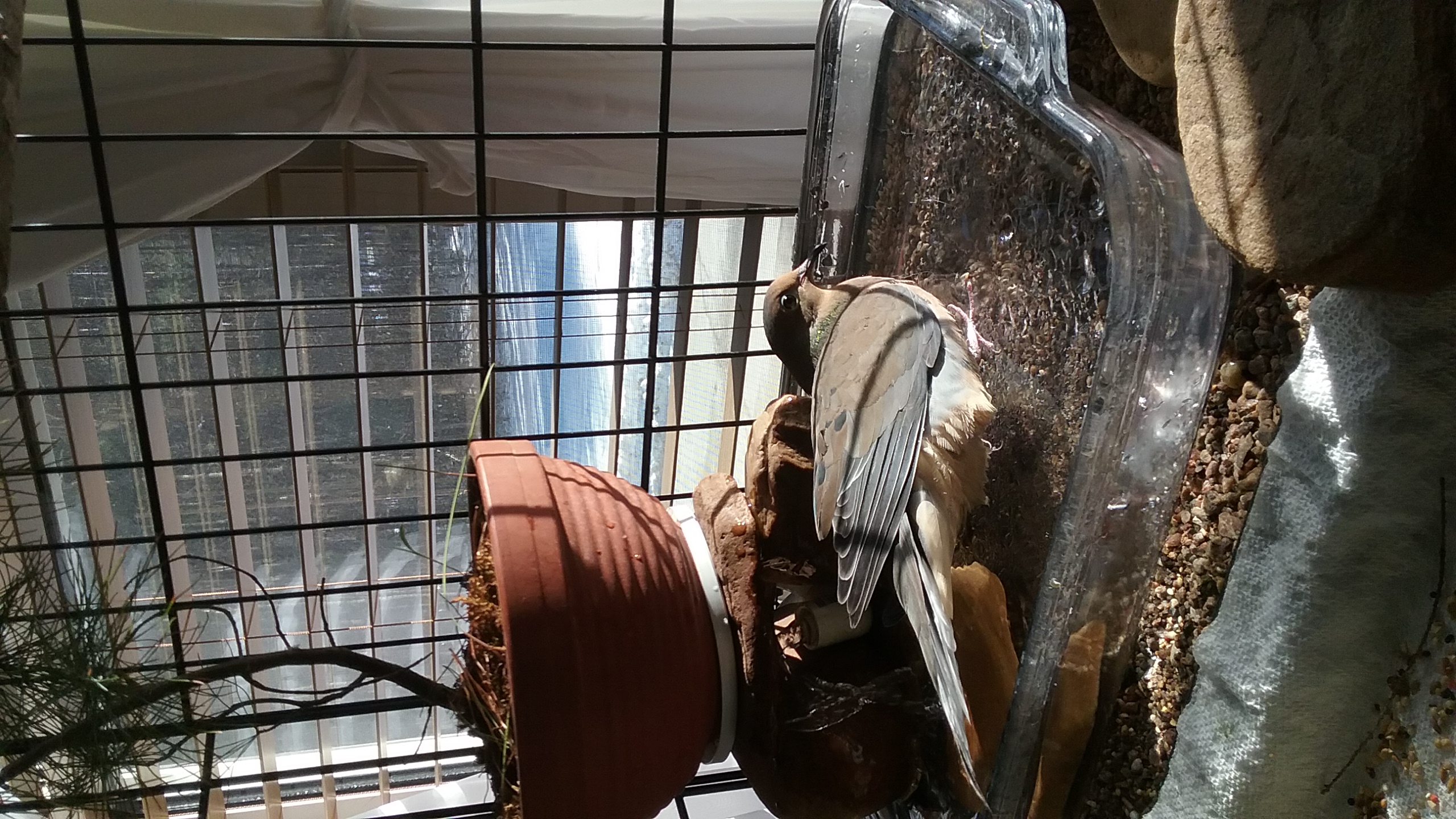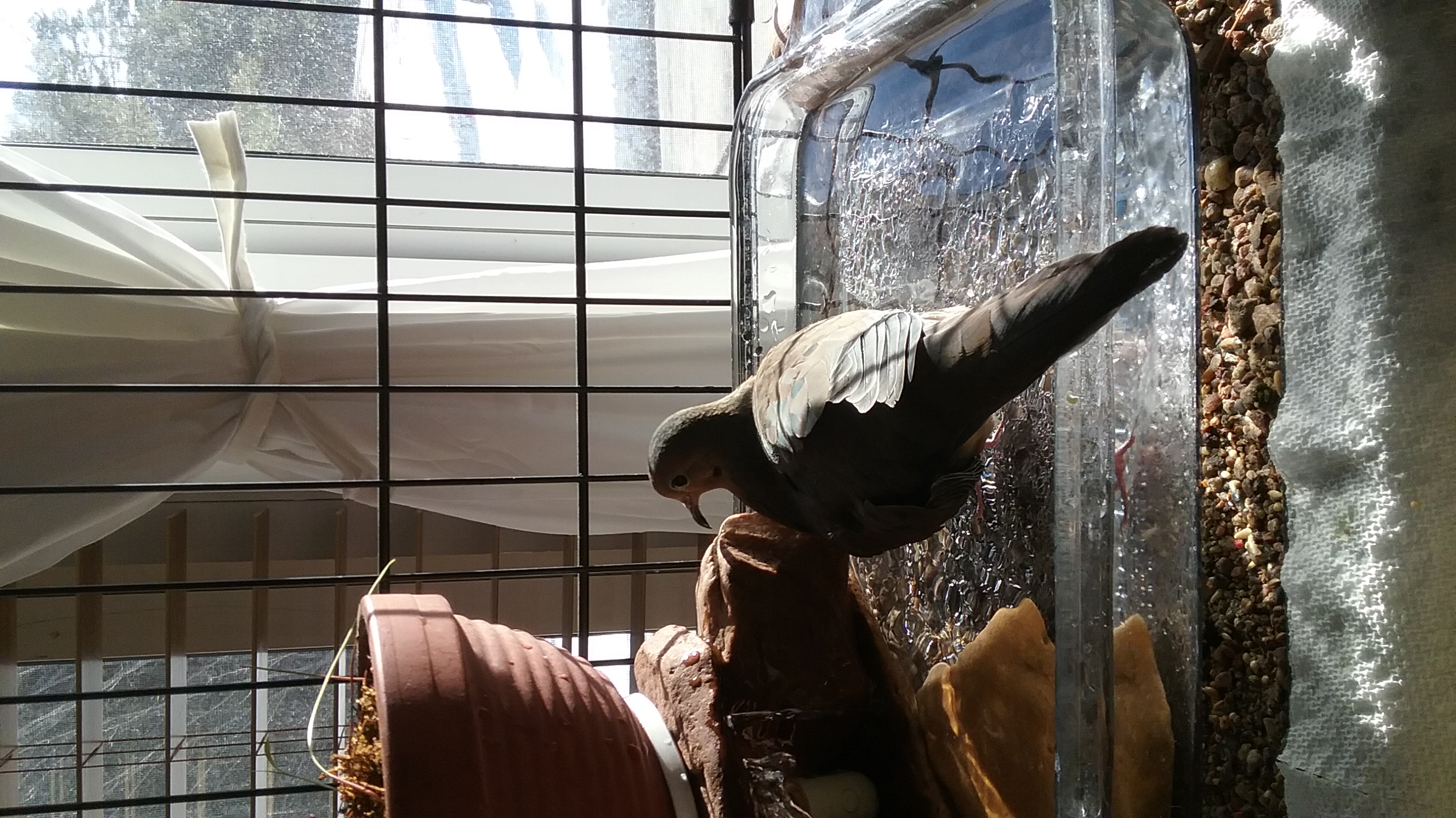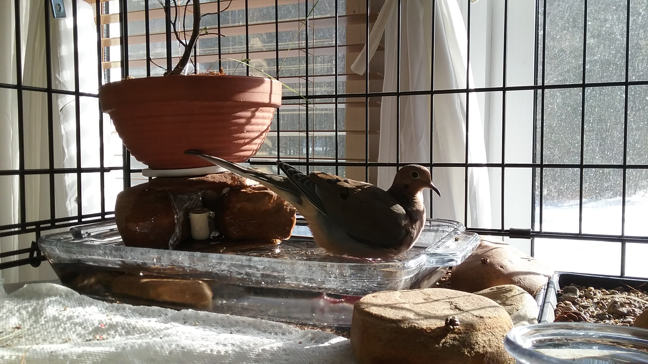 “LATE LUNCH” BUT, FROM BEHIND ME, I HEARD A MOST-FAMILIAR “SPLASH”... YONAH WAS IN THE POOL! SWIMMING ABOUT... IN THE POOL! HIS ROOM THERMOMETER READ 20,7°... THE OUT-SIDE WEATHER REPORT CLAIMED A RATHER BRISK -6° WITH A CHILL OF -11° UNDER THE GREY SKIES AND LIGHT SNOW STILL FALLING... *** BUT... AT “CLUB TAUBE” IT WAS, OBVIOUSLY, “SWIMMING TIME” **** !!! NOW... IMAGINE THAT ! IT'S AS I SAY: WITH YONAH, THERE'S NEVER A DULL MOMENT, NEVER A MOMENT WITH-OUT SOMETHING TO BE AMAZED BY AND WITH! SWIMMING... ON THE 2 JANUARY ! (And I'm so worried about giving him a “proper and good life”... not to mention those who would come and take him from me... and THIS! Clueless lot, that.) AND HE REALLY ENJOYED HIS SPLASHING ABOUT TOO! FIRST THE LEFT WING UP, AS HE DOES, AND THEN THE RIGHT WING! A BIT OF A “LOUNGE”, A BIT MORE SPLASHING. IT'S ALWAYS A JOY, FOR ME, TO SEE HIM ENJOYING THAT LITTLE BIT OF A POOL, AND ESPECIALLY NOW THAT, UNDER THE CLEAR GLASS, THE SAND IS VISIBLE. BETWEEN THE RIVER ROCKS AND THE RIVER SAND, WITH THE LITTLE WHITE PINE ABOVE, IT ISN'T ACTUALLY A MOUNTAIN POOL, BUT IT SURELY DOES HAVE THE ALL THE ASPECTS OF ONE... INCLUDING THE TRICKLING OF THE WATER AS IT COMES UP OUT OF THE LITTLE FOUNTAIN, SPLASHES OVER THE ROCKS AND GIVES SOME “MOTION” TO THE WATERS. (I have to wonder if that motion in the water isn't what's most enticing about it... AND... it gives such a sparkle of delight to my old soul, I'm so grateful that it occurred to me to include that little fountain with Yonah's pool. To think: ALL of this, from the “crate”, as it is, to the sands, mosses, trees... the “pool”, the fountain... ALL of it is the result of my own “gut instinct”. And it works so well! And I'm SO grateful that I have this little “internet” venue to pass this along to others. Maybe I can be instrumental in making the lives of other mourning doves, other birds... and other “Little Ones” of all sizes and kinds, more pleasant by getting Yonah's story out to the world. I can only hope... I can only hope that “apathy” hasn't taken control, and that “self-serving” isn't yet, the predominant sentiment.) MEANWHILE... YONAH HAD HIS DIP IN THE POOL, HIS “NEW YEAR'S BATH”... and I of course, got video of it because it's always amazing to me to see him so happy, splashing about.