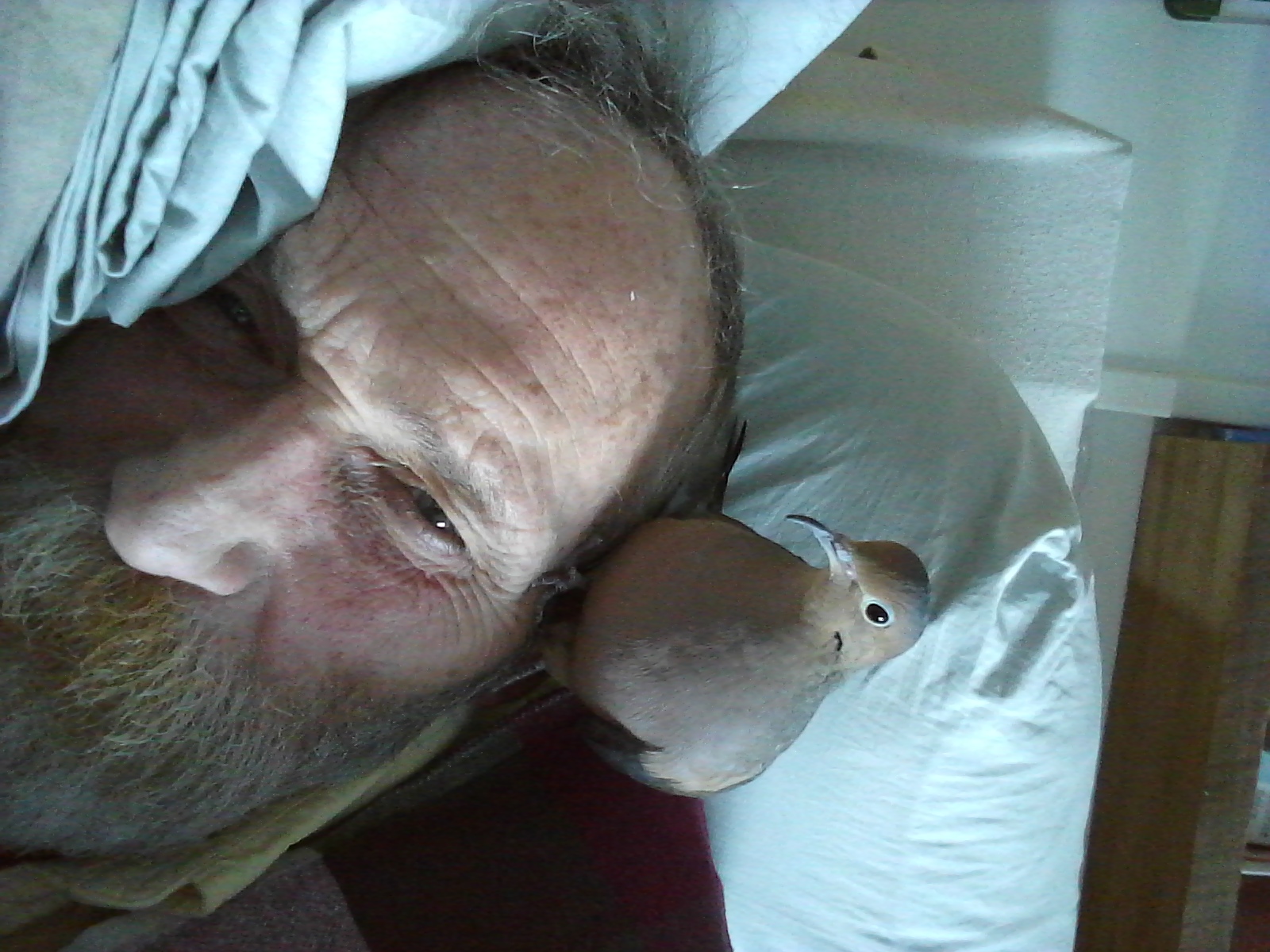 Had a bit of a 20-minute snooze after lunch break and... YONAH CAME RIGHT OVER, LANDED ON MY SHOULDER AS I LAID ON HIS FUTON. HE TODDLED DOWN MY TORSO, LEG AND TO MY FOOT WHERE HE PAUSED A MOMENT BEFORE COMING BACK UP TO MY SHOULDER. I closed my eyes and half-dozed but when I opened my eyes again... HE WAS RIGHT THERE, STILL ON MY SHOULDER, AS COMFORTABLE AS HE COULD BE! It's not that I have a snooze during the day... “WE” have a snooze! I used to think it a “one-off” or “coincidence” that he came when I lay down but, after all this time and as often as he does, it's obviously “intentional”. So... so much for “simple instincts” and the likes.