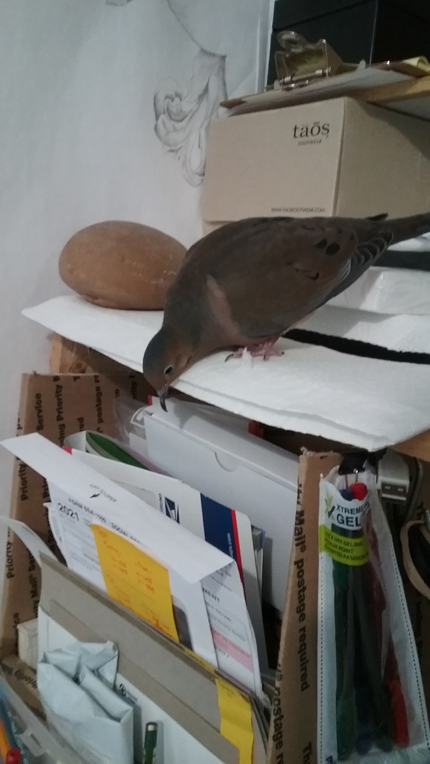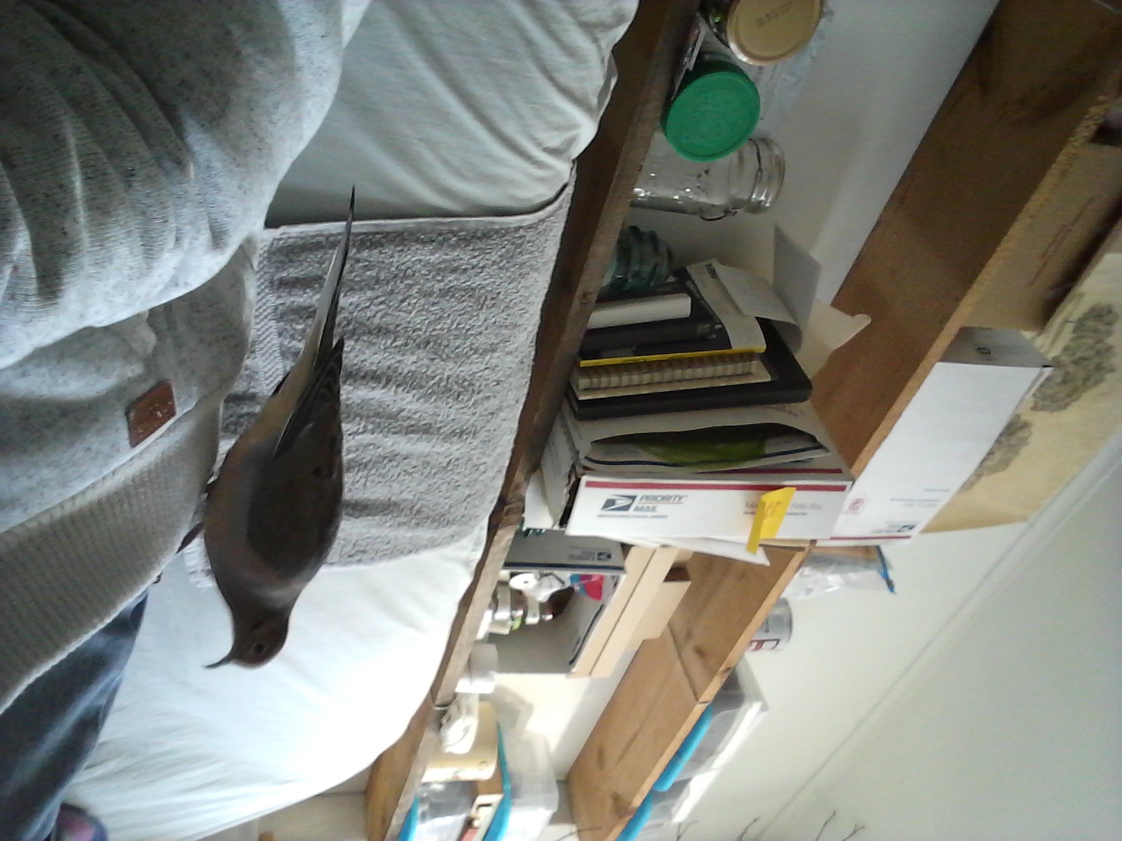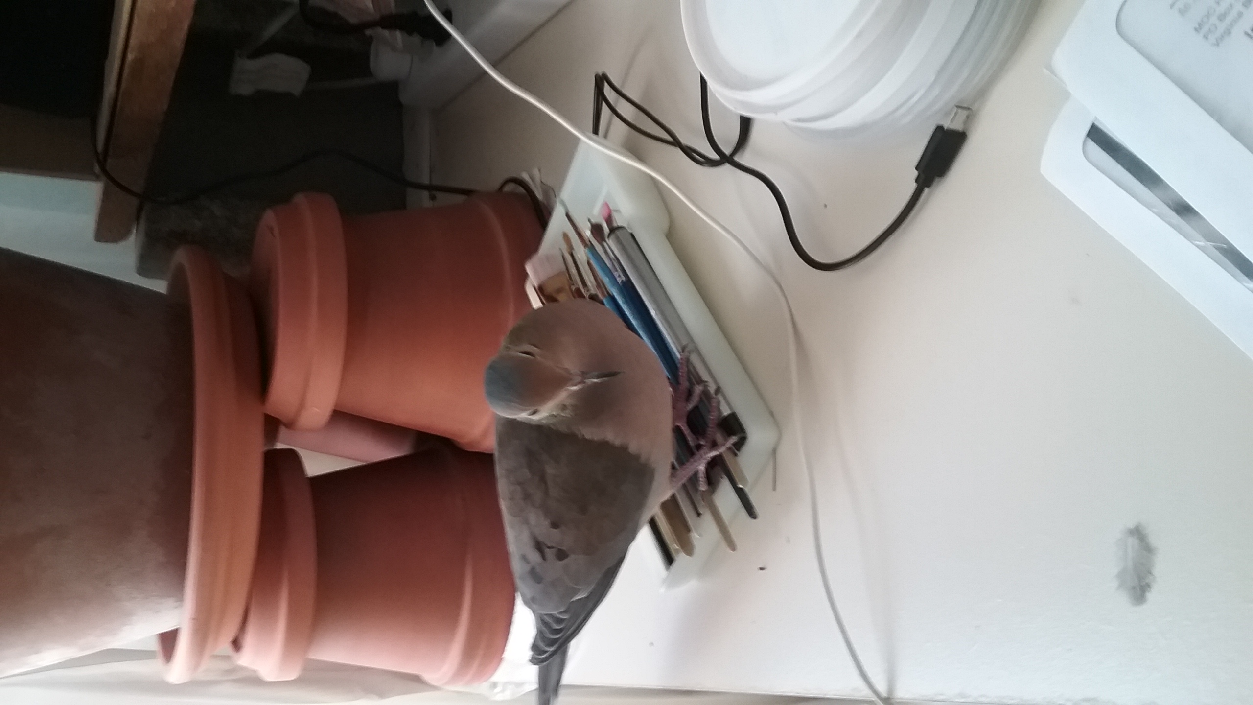 At 19.30... I got up, removed my things from the work table and Yonah? Well... I made two little trips to the kitchen as I removed my item and both times, he called. It was heart-breaking... again, he seems to not want to be left “alone”... and I wish he could know that if there were a way... we'd “snooze” the night away together... either in his house or on his futon. But, he's always slept in his house at night, and, except for the times when I was on his futon, comparatively few, always by himself. Well, I'm looking forward to next week... I'll be ordering a pair of... gods help me... “decoys”. They're quite the same colouration and size as Yonah, little mourning doves, used to lure in other mourning doves for the demented hunters. But I'm curious to see how he'll react to them. If one passes a test, I'll go back to considering a companion dove for him. If not, if he responds to them as he did with the “stuffed dove” that I still have yet to finish... and he doesn't seem too happy with that one, well... we'll take the situation from there as needed.