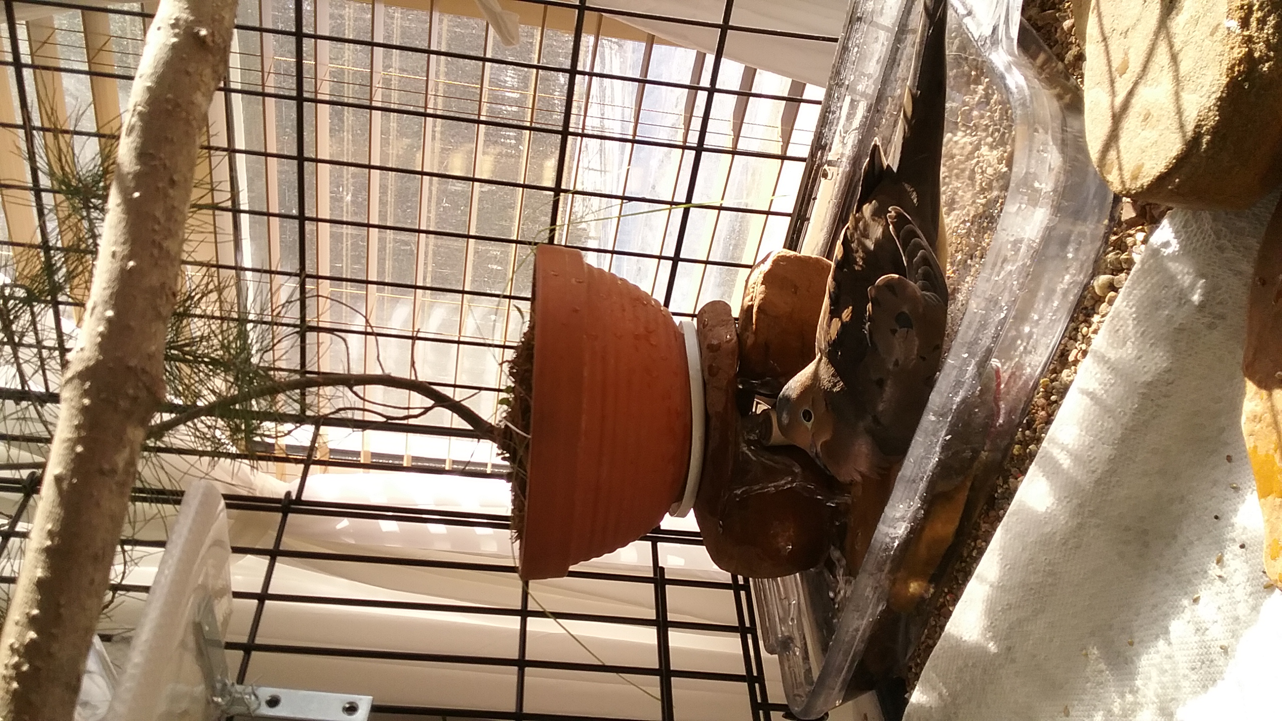 And the rest of our day consisted of BRILLIANT SUN-SHINE pouring in through his windows... and a nice warm space, protected from today's crisp cold out in the world. (It was, as it is, hard for me to see the other doves, out in the yard, having their “Winter” breakfast, all fluffed to keep warm. But it was a comfort to know that Yonah was quite comfy... and was eating just as well... if not a bit better... only because he was able to eat in the warmth of HIS room, in HIS house.)