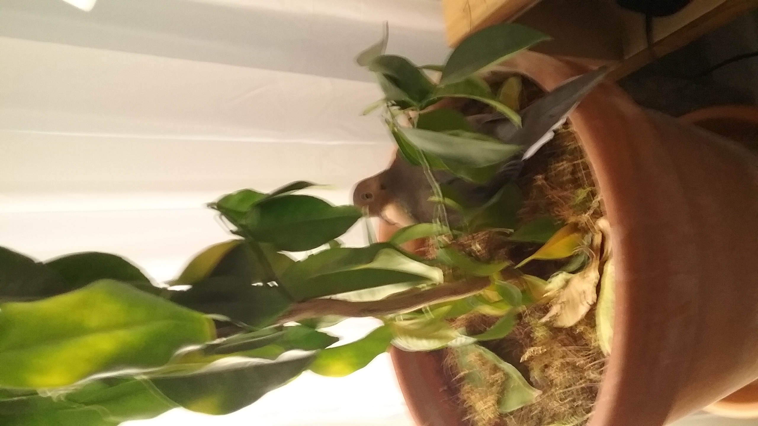 Over-all, it was a quiet sort of day together. What began as quite a “busy” morning, with Yonah flying about, talking, in almost full “conversations”, actual “dialogues” (he'd coo to me, I'd coo back... and we'd go on for 10 minutes at a time and OH! what JOY that brings, thinking that I MIGHT be saying something that makes some sort of “sense” to him, but OH! how it puts me in my proper place, not understanding what he's saying to me... me... the “brilliant human”... never mind), calmed right down to me at the work table, when we weren't “cuddling” and playing, and him well... At one point, it appears that I wasn't giving enough “attention” to him and as he went about the room, futon, shelves, floor, and where-ever he wanted to be, HE CAME OVER TO THE WORK TABLE AND RIGHT UP ONTO THE KEY-BOARD OF THE LAP-TOP! AND HE WAS QUIT CONTENT THERE, LOOK ABOUT AND AT WHAT WAS ON THE SCREEN! And what was on the screen was my “shopping”... for HIM! I was looking at the “decoys”, pricing and availability, so what was on the screen were images of “mourning doves”! I HAVE to wonder if he actually recognised them, and I seriously believe he DID! (I remember when I was looking at the “James Yule” video, cited in the article on what's now the second page of Yonah's site, of the literally “mourning” mourning dove, standing beside a deceased mate. Several seconds into it, Yonah, who had been on his door perch, saw it, over my shoulder, and gave a deep “woo-HOO-HOO-HOO-HOO-HOO!” and came RUSHING to the work table! And there, he stood, watching, intently, to the point where, the very second I understood that HE understood what he was seeing, I HAD to stop the video! He saw a mourning dove in pain, and a dead morning dove and he UNDERSTOOD! So, I've no doubt that he recognised the “doves” on the screen as I looked and shopped.) Needless to say, I caught a couple of photos and, because the images bothered ME, being “decoys” (the sickness of the very notion, for anything other than to attract to give safe haven and food), I quickly closed the “page”, closing the images. BUT, that Yonah took notice and came for a better look... well... if nothing else, HE'S PROVING THE SENTIENCE OF MOURNING DOVES AGAIN, AND AGAIN! And, again, he's teaching ME SO MUCH MORE... EVERY DAY, AND EVERY MOMENT OF EVERY DAY! (I really ought to dedicate time to writing something more than this Journal, a “paper”, of sorts, an article, to be presented to, perhaps, the “Audubon Society”? Some “Natural History” group? I'm certain they'll refute, or at least, try to refute. But, I see what I see, hear what I hear and have come to know what I know... and that's all due to my Little Guy here, my little Heart-and-Soul. I continue to believe that the only reason MOST “scientific” types aren't aware of the MARVELS AND MIRACLES of mourning doves is because they consciously choose to ignore, and/or refuse to invest the time in actually learning. Meanwhile, this time with Yonah... how I wonder: Why me? And what can I do to make “life” better and safer for mourning doves... and ALL the rest of the “animals” - a term I'm more comfortable with since having memory jarred by the aforementioned article on page 2 of the site. “Animal”, derived from “anima” meaning “breath”... and Yonah IS my “breath”... LITERALLY!) WELL! And... WELL! Today, again, he also took to the potted orange tree! He's done that before, for a little while. I still don't know what he “finds” in there. It's in regular soil, has been for years now, so there's nothing of any particular peculiarity in it. But today, he spent quite the while, nestled in the mosses that cover the soil, at the base. And I mean “nestled”. He was as cozy as he could be, and he stayed there for quite the considerable length of time! Now, I know that mourning doves can be attracted to planters and larger potted plants on porches, and they'll nest in them. So now I'm wondering if Yonah isn't “nesting” in the orange tree. He's not bringing any “nesting materials” to it. But, as I say, there's a bit of moss in the pot, and the moss is the little “toss-aways” from his house, the smaller bits that crumble off his “flooring”. And he does enjoy lounging in the moss in his house, having formed a little divot in his favourite spot. And mourning doves take equal share in tending to nests when mated (and, well, as it would appear, Yonah and I are... “mated” now). One of the items on the shopping list for this week is what's called “dummy eggs”. They're meant to discourage females from laying their own, especially those “in captivity”... the “store/business acquired” Little Ones. The laying process depletes their calcium and can prove harmful if not fatal. So these “dummy eggs” give them the impression that they've laid their share and will stop. Meanwhile, with mourning doves, both the male and female have a strong “feeling” of responsibility to their own Little Ones and BOTH will tend to eggs and young. So, I'm thinking that it might be a good idea to give Yonah the opportunity to “fulfill” his “sense of responsibility” and provide him, temporarily, with some “eggs” to tend. If he's “nesting” in the orange tree... it would appear this is the time for such action. And when the time comes, I'll remove the eggs... as though they'd hatched and developed into the Little Ones who, as Yonah himself once did, “flew off into independence”. And he can take his rightful pride in his success.