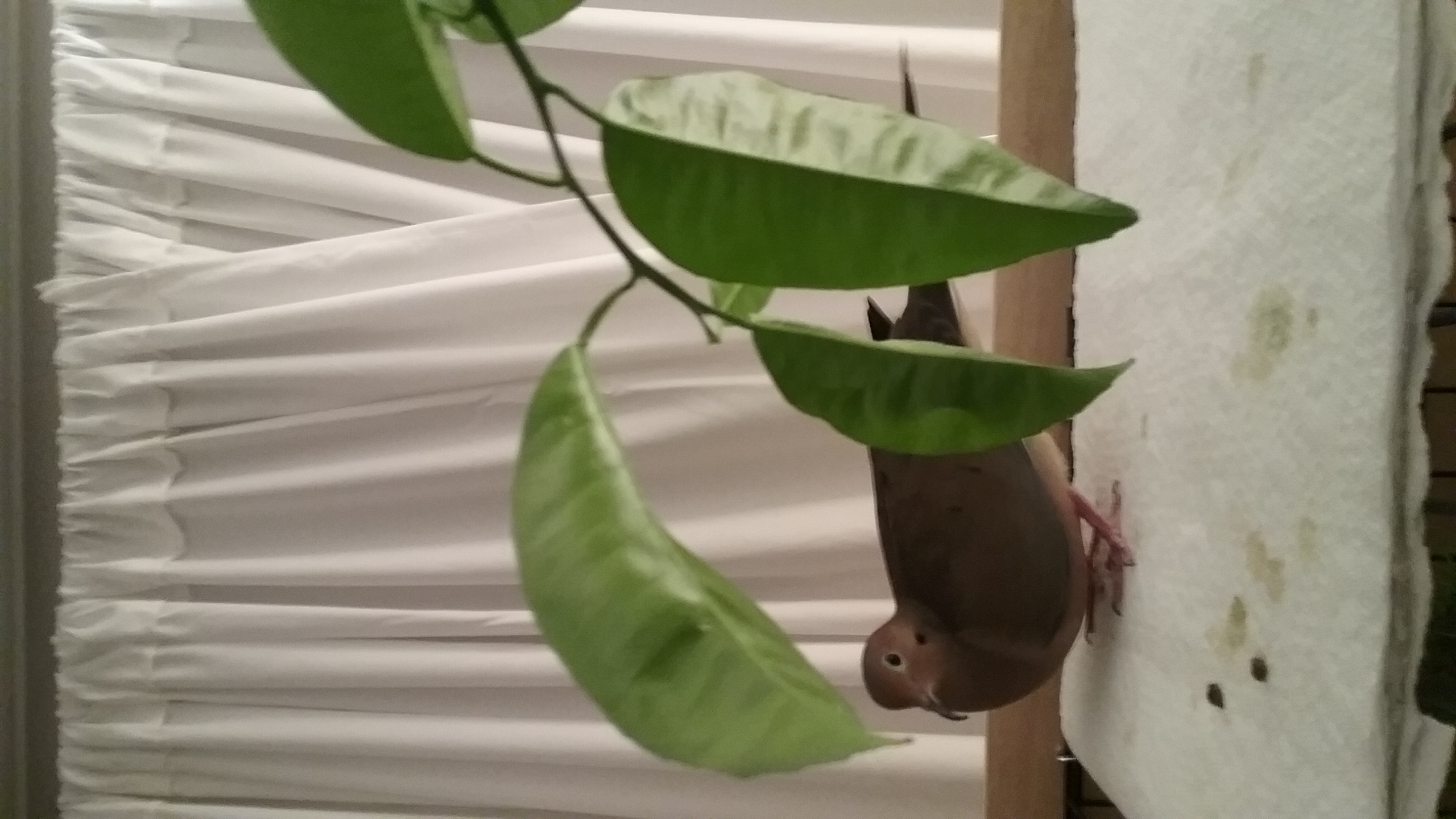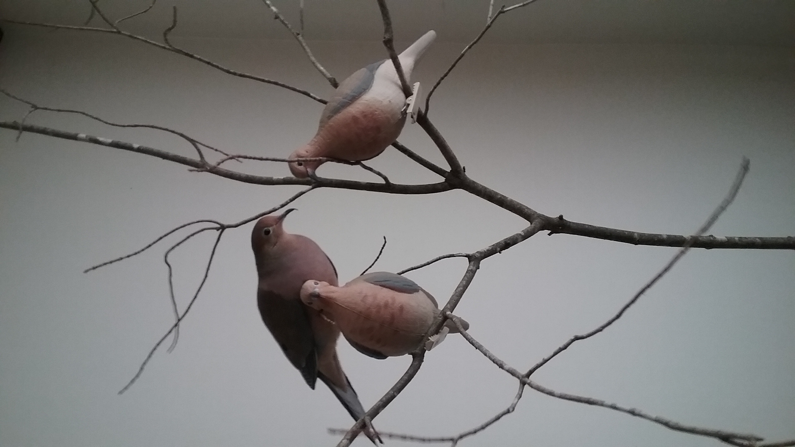 When I'd done with all the “cooking” (prep), it was time for washing-up and so, more time in the kitchen... WELL...!!! I made a stop in Yonah's room to let him know that I'd be in the kitchen and ... Out came Yonah! On my shoulder! So we took a little “stroll” around the house. I like to “help change the scenery” and our “strolls” are good for that. But when we got to the living-room, he saw the “decoys” (that failure of mine) in the tree limb I have there in case he ever decides to take a flight about and needs a place to catch-a-breath! OK! He was ON IT! More like on THEM! He took wing and headed directly for the limb and was hopping back and forth ON the motionless little replicas, standing on their backs, their heads, pecking at their faces! He was obviously some-what disturbed by their presence but, after a couple of boisterous “woo-HOO-hoo-hoo-hoo”s, it seems he decided that, if they weren't going to be polite and respond to his “greetings”, he'd just make himself comfy... on the back of the “male” of the pair. And there he stayed... for several long moments. I went back to the kitchen to finish the tiding and get on with preparing some of the other groceries for my evening meal and, as I worked at the kitchen basin, from behind, I heard the flutter and whistle. Yonah headed back to his house! (When I looked in, he'd gotten hungry and went for a snack. The “novelty” of the “new doves in the house” had completely vanished. The day moved on.)