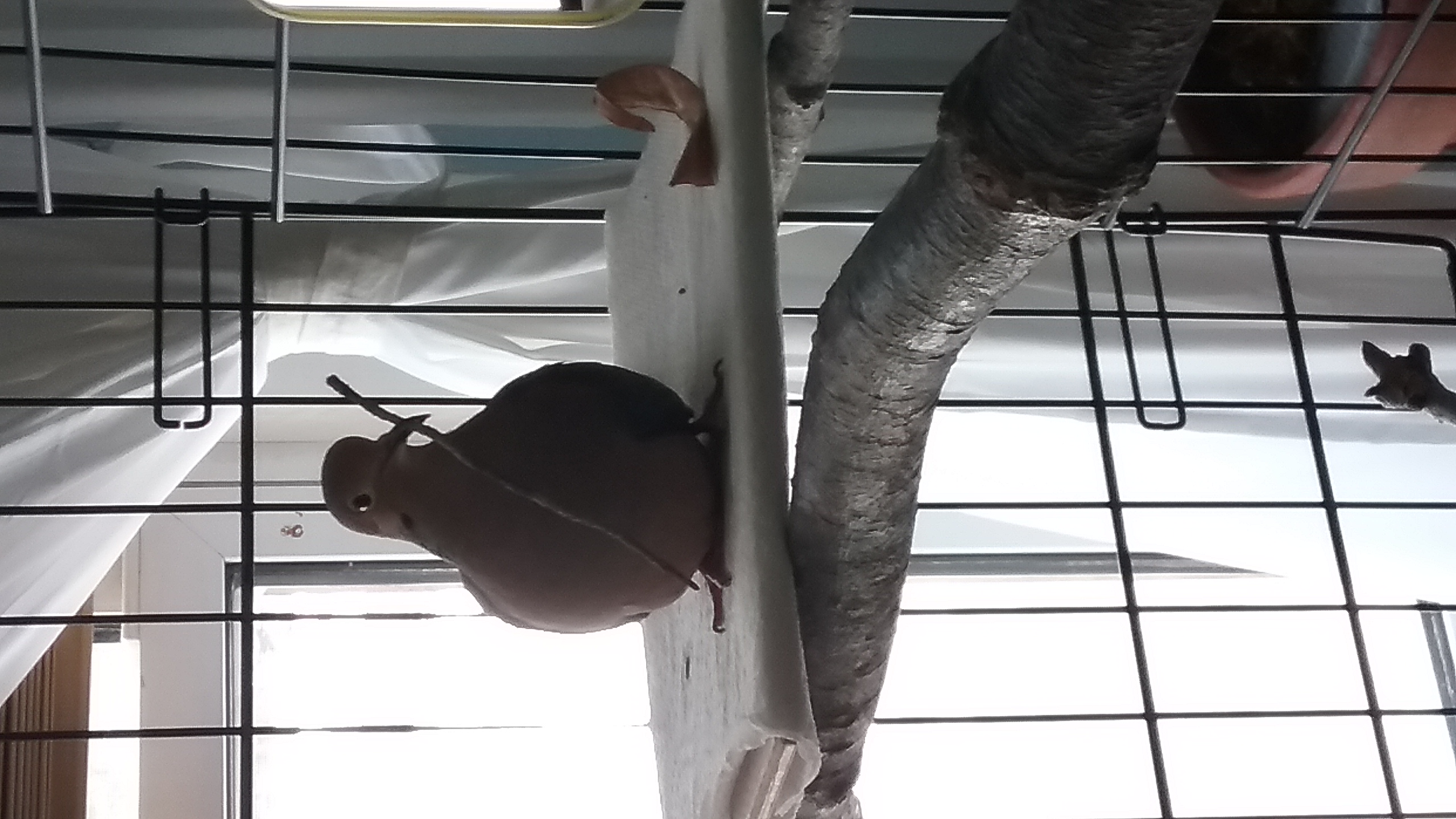 Yonah was certainly awake when I got into the room. And he was ready for morning kisses, stretching his wings, preparing for “take off”! So we got “Good morning” pecks and kisses in, and a cuddle or two and as I took the little tray with the water containers from the shelf below his house, Yonah hopped down to the door perch where he stayed all the while I made the “relay” with fresh water for his pool. He watched, he looked, he “supervised” all through my repeated coming-and-going, pouring fresh water into the pool as the “old” water (from last night) siphoned out and into the catch-bucket in the floor below. He watched as my arm passed over his head, reaching into his house, to the far corner where the water was poured. And at one point, he hopped over to the pool and, since the water there was fresh and cool and clean, took a bit of a drink and then hopped right back to his door perch.