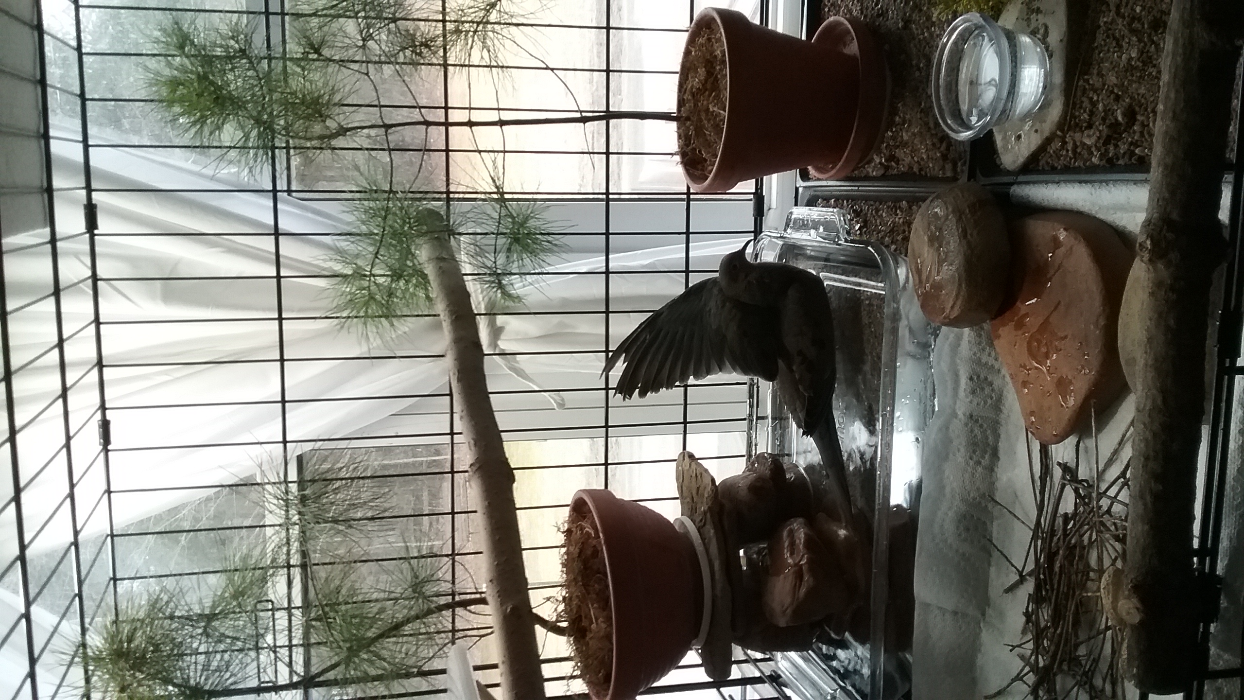 Out-side, the sun was trying to make its way through the remaining clouds of last night, a breeze blew quite crisp (for the end of March), but as I made my way into Yonah's room, it was delightfully warm and the day-light was filtering thought the blinds and curtains. In his house, Yonah was stretching his wings, making ready for that first “hop” of the day, from perch-to-perch.