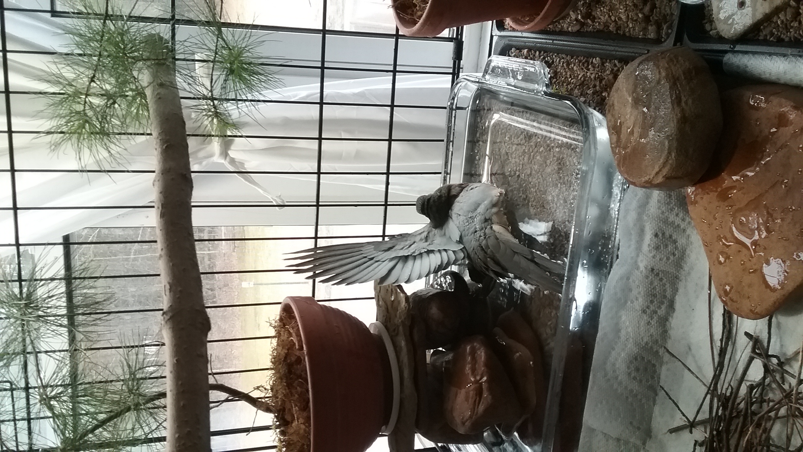I happened upon another web-site today (included, of course, in Yonah's “Bibliography” listing) that went into the care of doves (in general) and was SO PLEASED to see that including a “bath” in their house (OK, “they” called it “cage” and if that's what some people will do... “cage” a Little One, well...). “Doves”, it says, bathe weekly. Well, I was looking at, let's call them “domestic” doves, and perhaps they do bathe “weekly”. Yonah? Well, Yonah isn't “domestic”, nor do I think of him as “domesticated”. He still retains most of his own “wild” character and characteristics, and, as his “Portfolio” shows, bathing isn't a “weekly” affair for him. It could be twice weekly, it could be bi-weekly. But, I AM comforted to see somebody else urging the inclusion of a place to bathe. (Though there wasn't any mention about keeping the water clean and fresh since doves will drink from that bath. Then again, it might just be my personal opinion but I say: If you wouldn't drink it, it doesn't belong in a dove's house.
