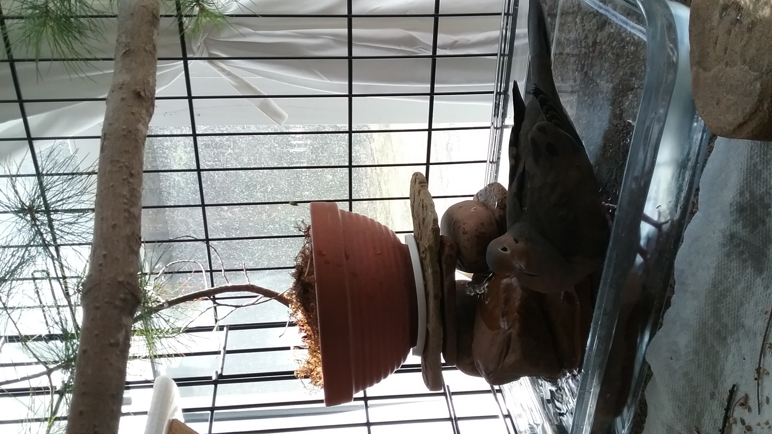 From then on, the moments rushed by... he had his meal, I had mine and after all was re-settled, it was time for “evening routine”... water changes, fresh food, and closing blinds and curtains. Tonight will be rather cold, but certainly not bitter-cold, but I take no chances: before the chill arrives, the windows are insulated. Yonah “supervised” from his position on the pillows on his futon and when I put up the back board, he flew into his house, went directly to the loft mirror and gave a couple of coo's as if saying “You see that? Already!” Yeah, me too... “already”. Our day was coming to a close.