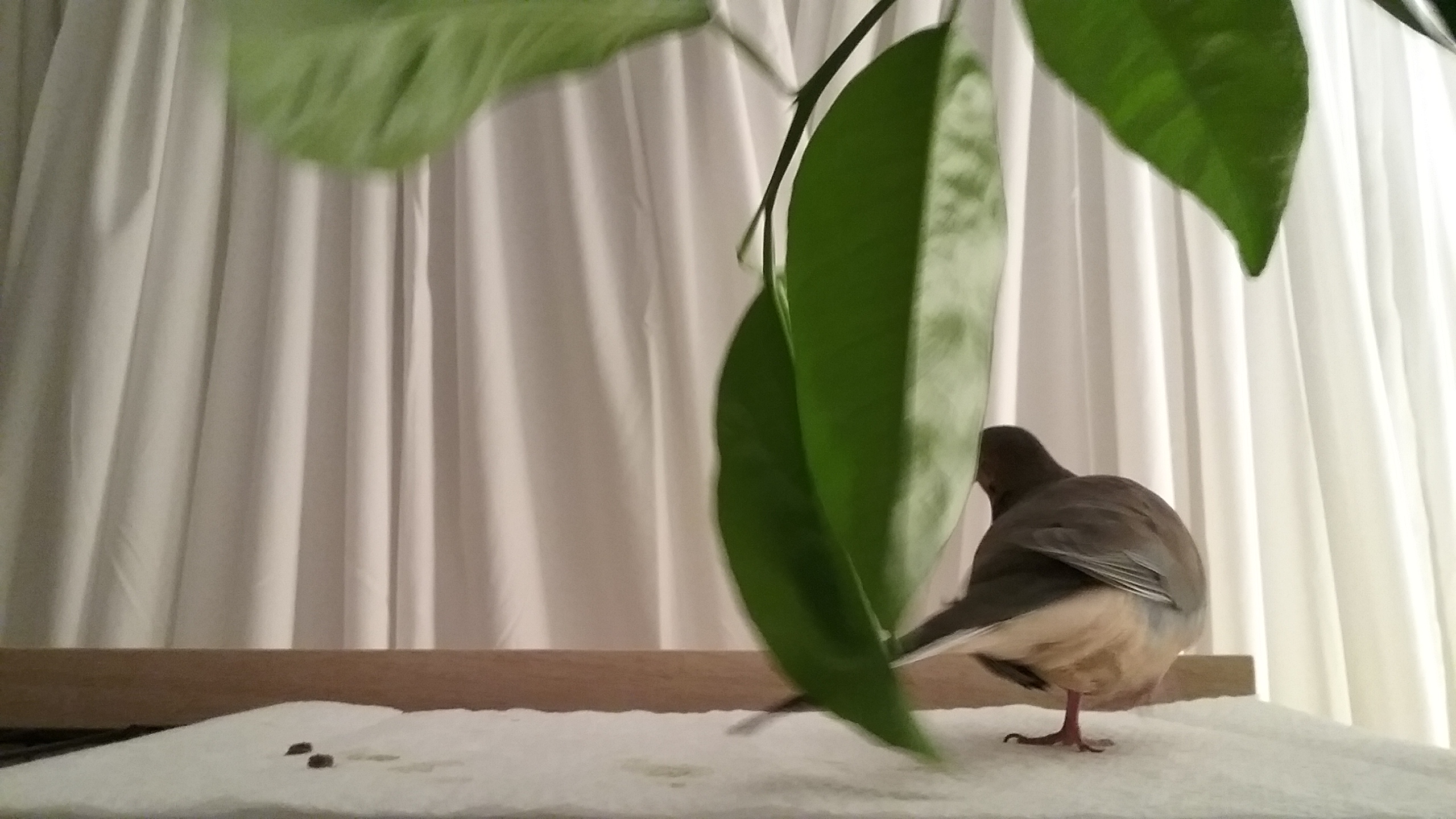 And as the day moved along, I was in and out of his room but he was too. When I was in the kitchen, he was in the living-room. When I went into his room for a lie-down, he came over to the pillow for a bit and then headed out, through the kitchen, into the living-room where, just as I dozed, I hear him coo'ing. When I woke, as he does, he must have sensed it and came SOARING back into his room and to my leg where he toddled up, gave me a look (“Awake? About time.”) and was off to his house.