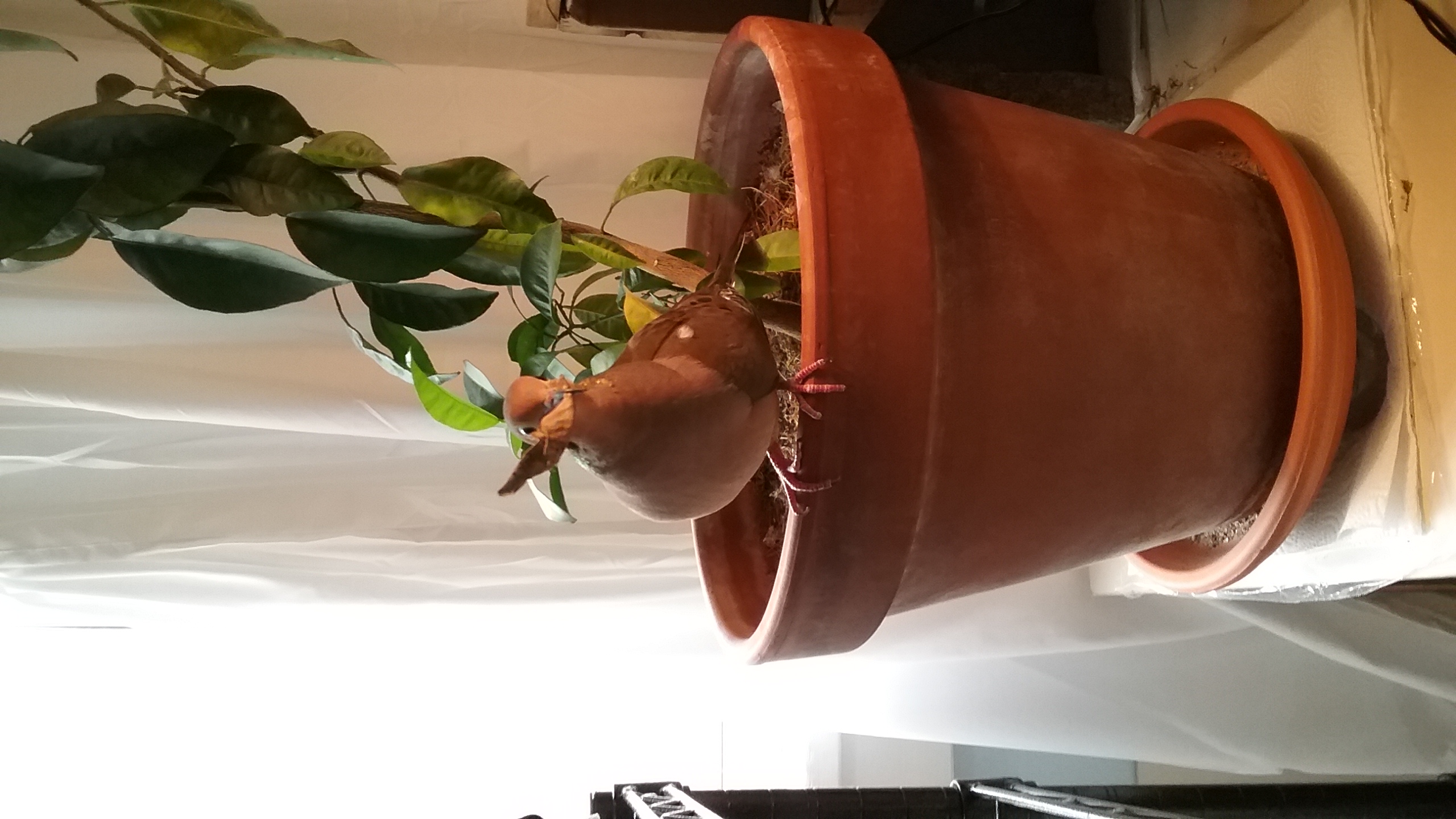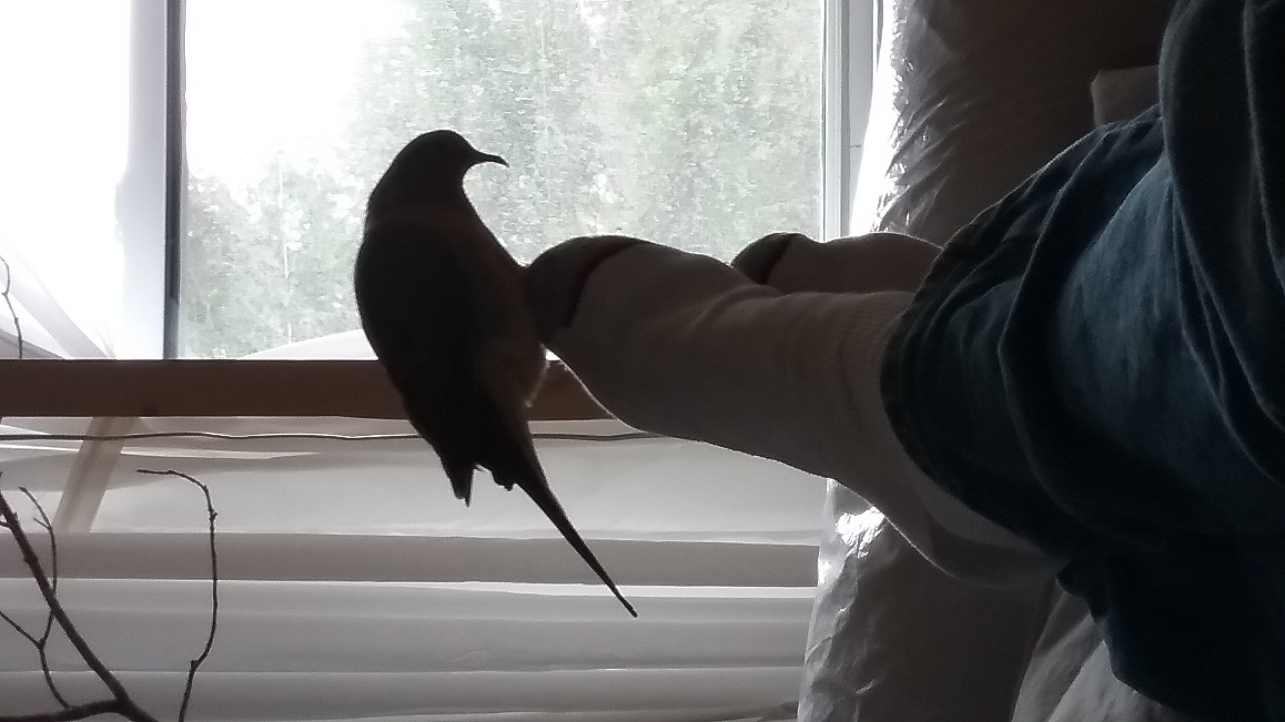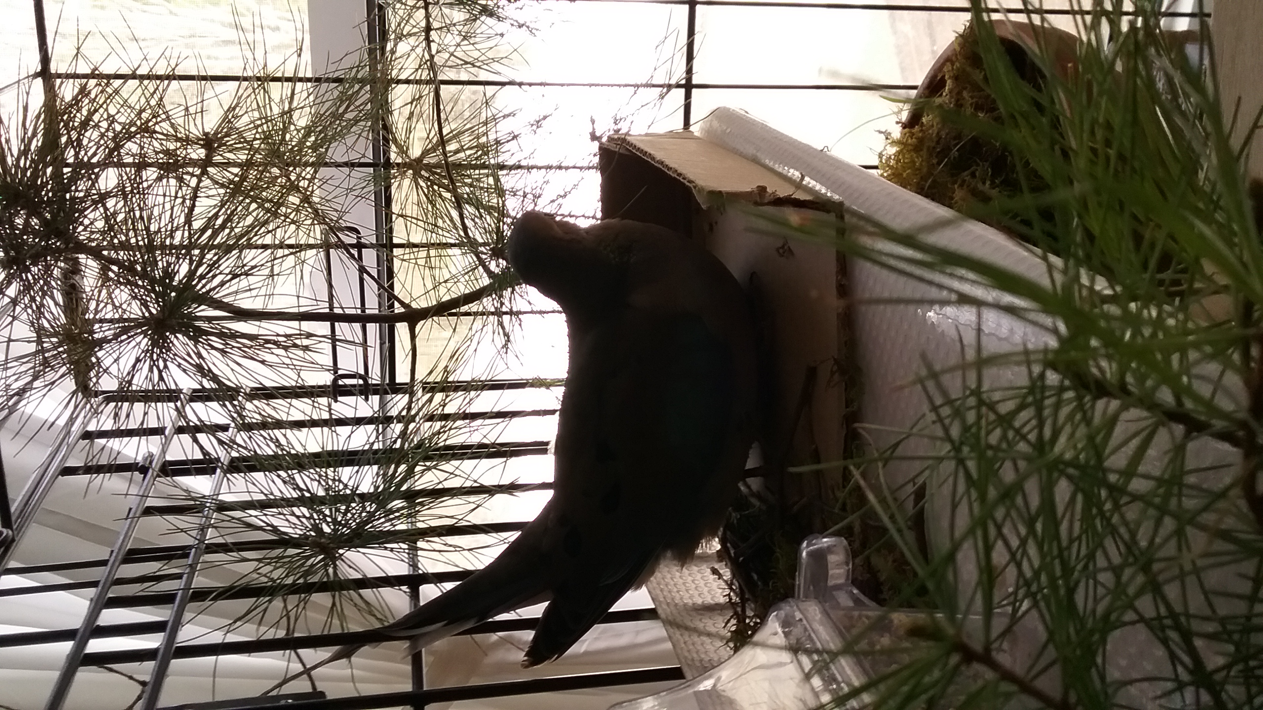 It was a day that was EXTREMELY difficult to see turn to an evening! (Especially seeing Yonah sorting through twigs and such even as late at 19.00!) But, by 19.30, he was up on his perch, and then to the door perch and... The sun had only just recently dipped behind the Western mountains so there was still quite a but of light left to the evening. But, again... mourning doves tend to “settle” round about 19.30 of an evening... and so, those out-side were, by then, already off to their night perches. And there's the need of 10-14 hours of rest... and GOODNESS! After all his work today and travelling and such... SURELY Yonah would be looking forward to settling down and tucking-in... (and he WAS up and about at 6.30 this morning... he was heading for a solid 13 hours of being up and about).
