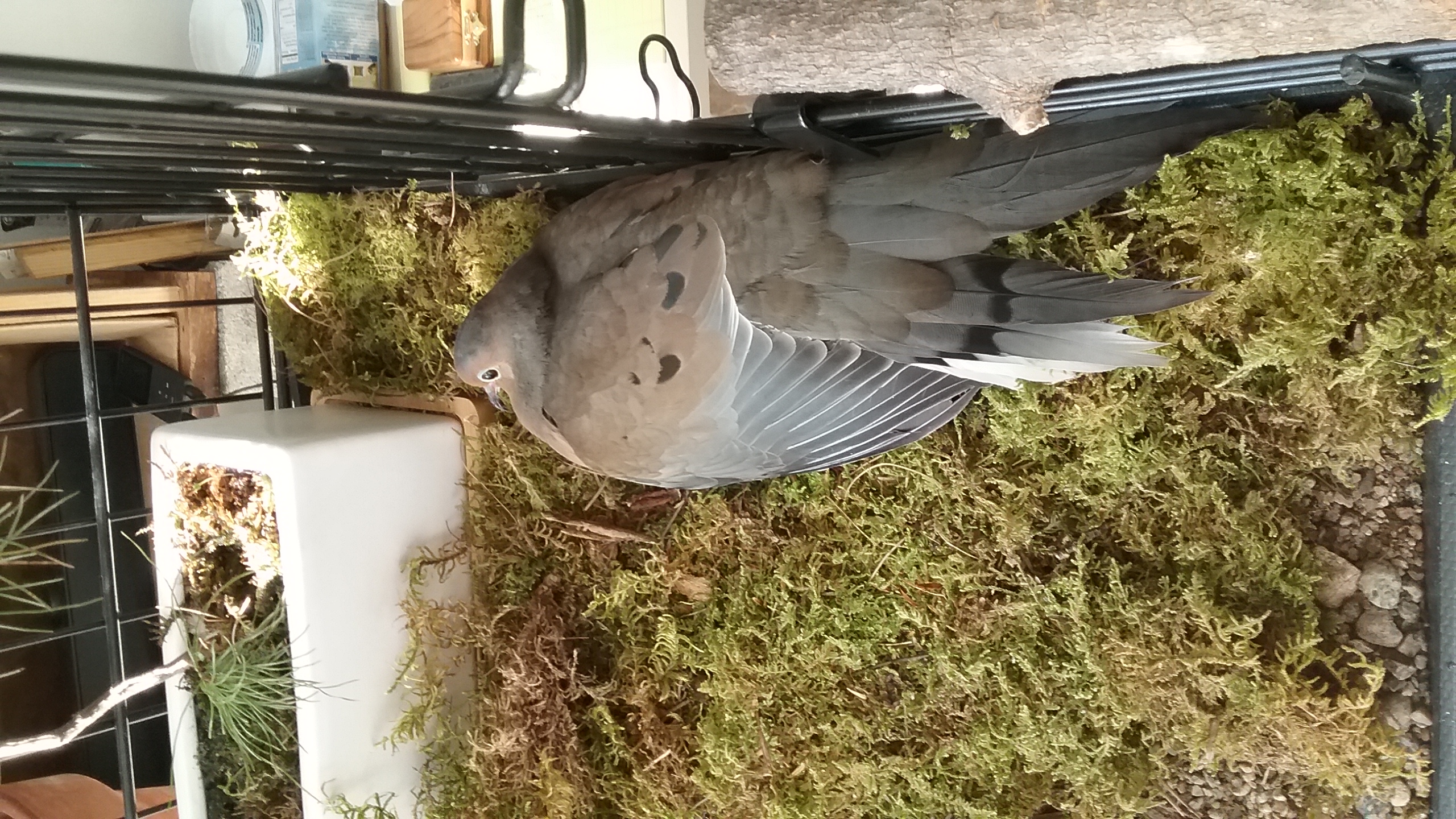 All that sun-shine pouring in through Yonah's windows DID manage to send some heat through the panes and... as I worked, bird-songs playing softly, radio on so low, I'd stepped out for a 'refresher” on my coffee and when I got back to Yonah's... he was no-where to be seen... well, not in any of his “usual” places. It took me a while and some serious looking until... Oh... THERE HE WAS... IN THE POOL! Just as still as he could be, standing next to the fountain, his colouring blending almost perfectly with the rocks and the terracotta planter with its white pine.. Not to mention, the river sand under the clear glass “dish”! It's another one of Yonah's traits that continue to amaze me: HOW ANY mourning dove is ever spotted in the wild... aside from when they're simply in the open. It seems that no matter where Yonah finds to get him-self comfy, he can “blend in” with just about any and ever back-ground. The carpeting in his room is beige, there's a dark grey runner in the kitchen, the carpeting in the living-room is dark brown... when Yonah stands on any of them, it takes a good “look” to find him there, with his touches of greys, black, browns, beiges. And it becomes all the more obvious that he can camouflage when he's in his house... with the beige of the river sand, the terracottas, and even the mosses! But today, it took quite a bit of “focus” to notice him, there, lounging SO comfortably, in his pool, soaking-in the coolness of the water and the warmth of the sun-shine. (The “serenity” of seeing him, my Heart-and-Soul, just enjoying him-self, in his pool, in the sun-shine, with absolutely NO concerns about or for ANY sort of predator coming for him - again - is one of the most calming situations imaginable. He's just so content... exactly as he should be... as ALL the Little Ones of this “Creation” ought to be. And it gives me a it of pleasure to know that I'm able to provide this for him.)