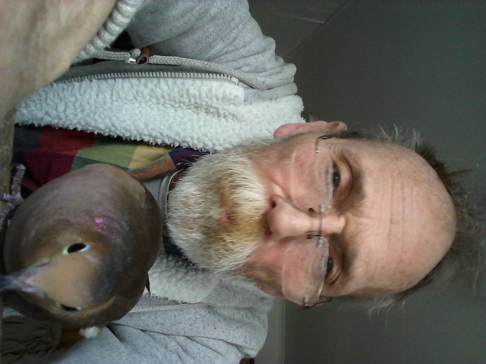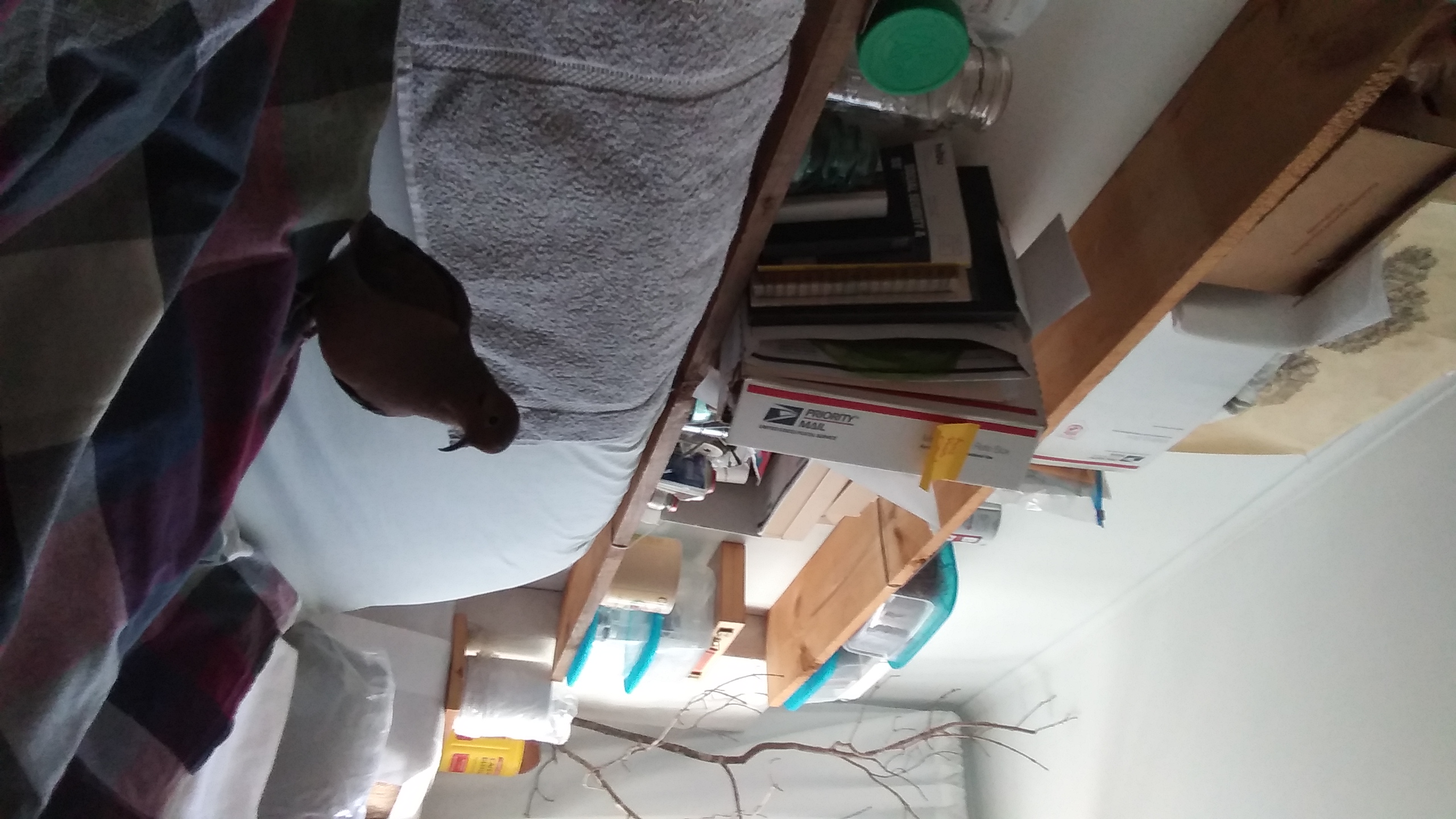 Now, I did go to the work table and no sooner had I sat down, Yonah was on my head, then on my shoulder, pecking at my ear. I leaned my head over toward him, he “nestled” into me for a moment and then... up and off and back to his house... He was “gardening” this morning.
