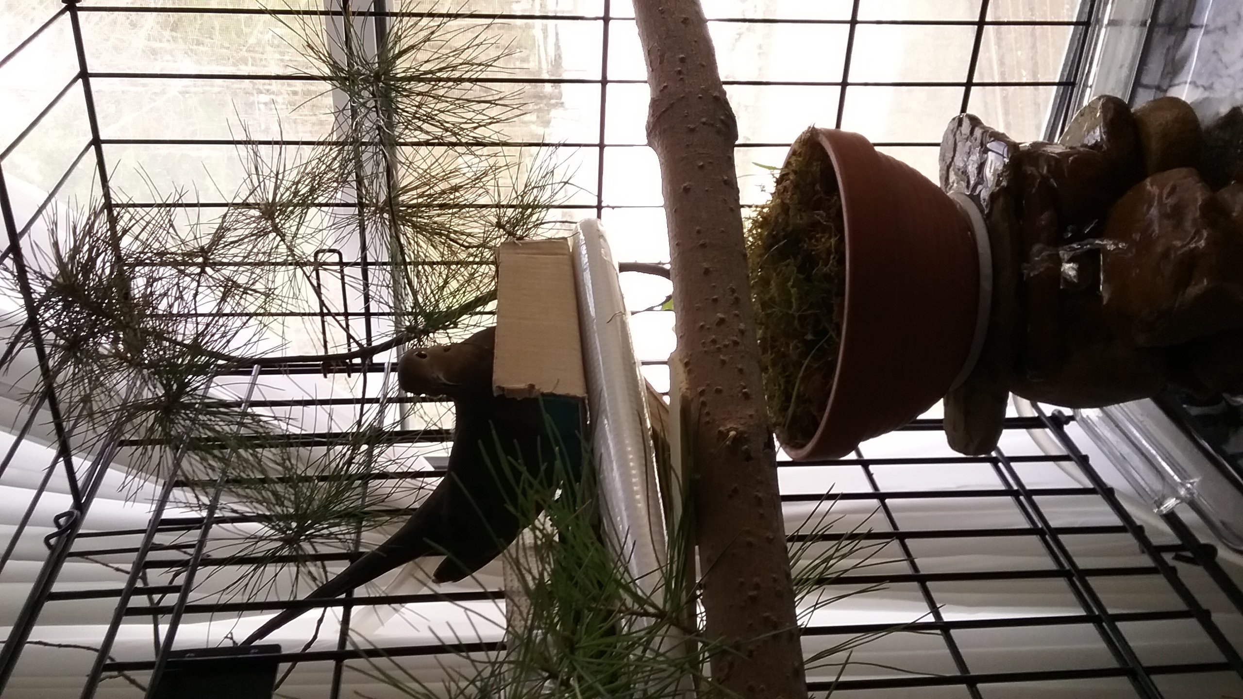 As I looked into the rest of his house and opened his door, I caught a glimpse of some “darker” presence... on the “floor” of his house, in the front-left corner, in front of his pool, opposite the little area with the mosses! He was “down”... on his floor! I was almost in a panic... wondering why! He isn't usually there even during the day, unless he goes over to sort through the twigs, or he's hopped out of the pool and is heading for the door perch. THIS wasn't “normal” and I feared he wasn't feeling well!