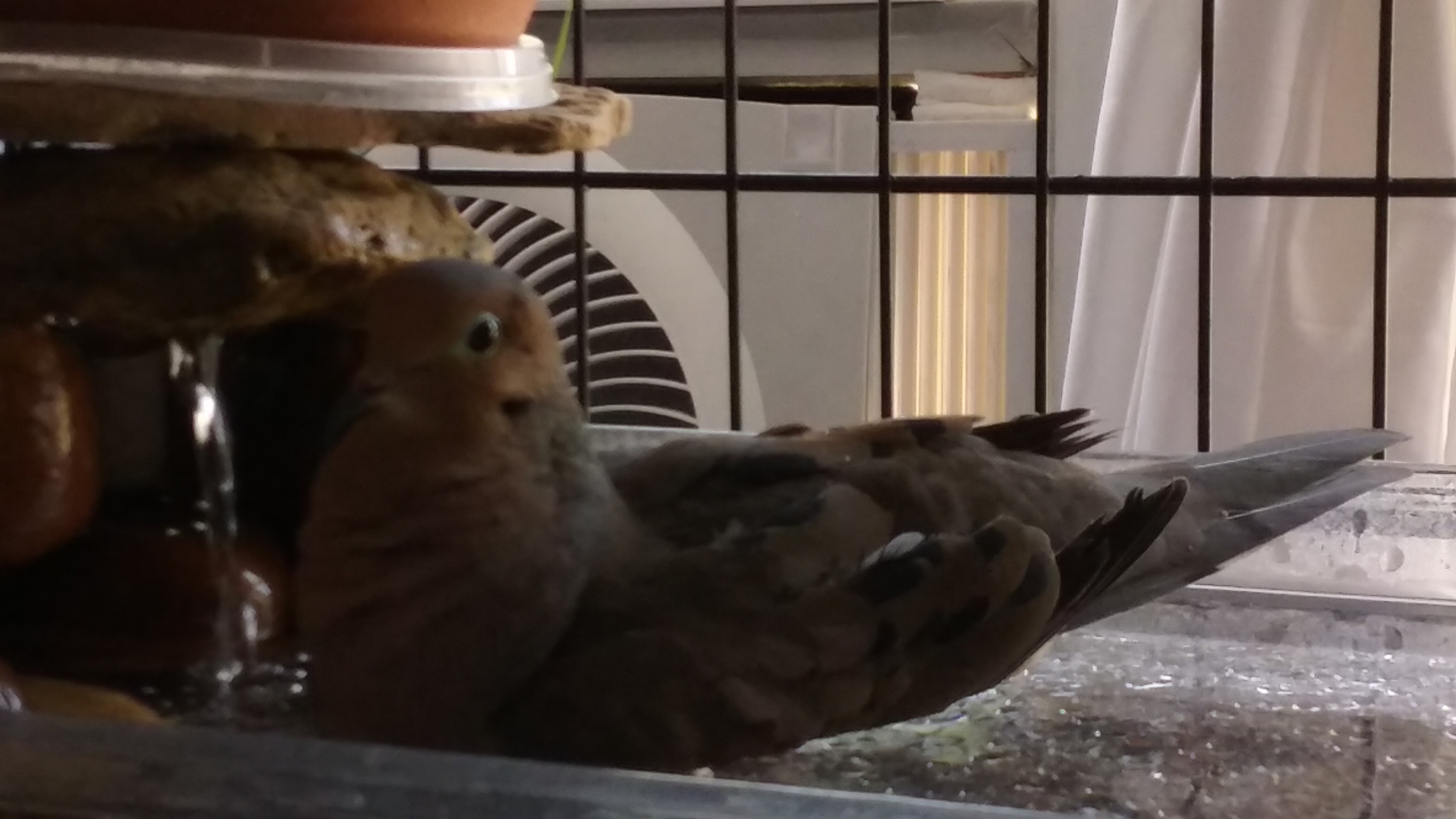 BATH-TIME! The temperature in Yonah's room was 27° and the humidity was, as claimed by the "weather report" for the day, 23%. I was still considering bringing Yonah out into the yard for a while, but he seemed so comfortable in the shade of his room and house... and the Yardies still hadn't come round so... I'd continued to work on my own little, other-wise trivial matters (and some more "curiosity" research that I do, on mourning doves... "education never stops"... I'd only just checked this evening's forecast, to see if we could get our time out-side when I happened to look up to see him hop along his house, over to the "pool" and up onto the little "ledge" (the "handle" of the dish) and, just as casually as could be, step into the pool! A few splashes and he made him-self SO COMFY for about 10 minutes of just "leisurely soaking"! And, only about an hour before, I'd changed the water in there because I wanted it to be fresh, since he drinks from it. What an absolute DELIGHT to see him enjoying the cool, clean water. What a tonic to the heart knowing that he has the opportunity to enjoy such a thing, with NO thoughts of "things" in the water, or predators watching and waiting over-head. And when he'd done with his "dip", he took to his little "beach" where he spread his wings and feathers to dry.