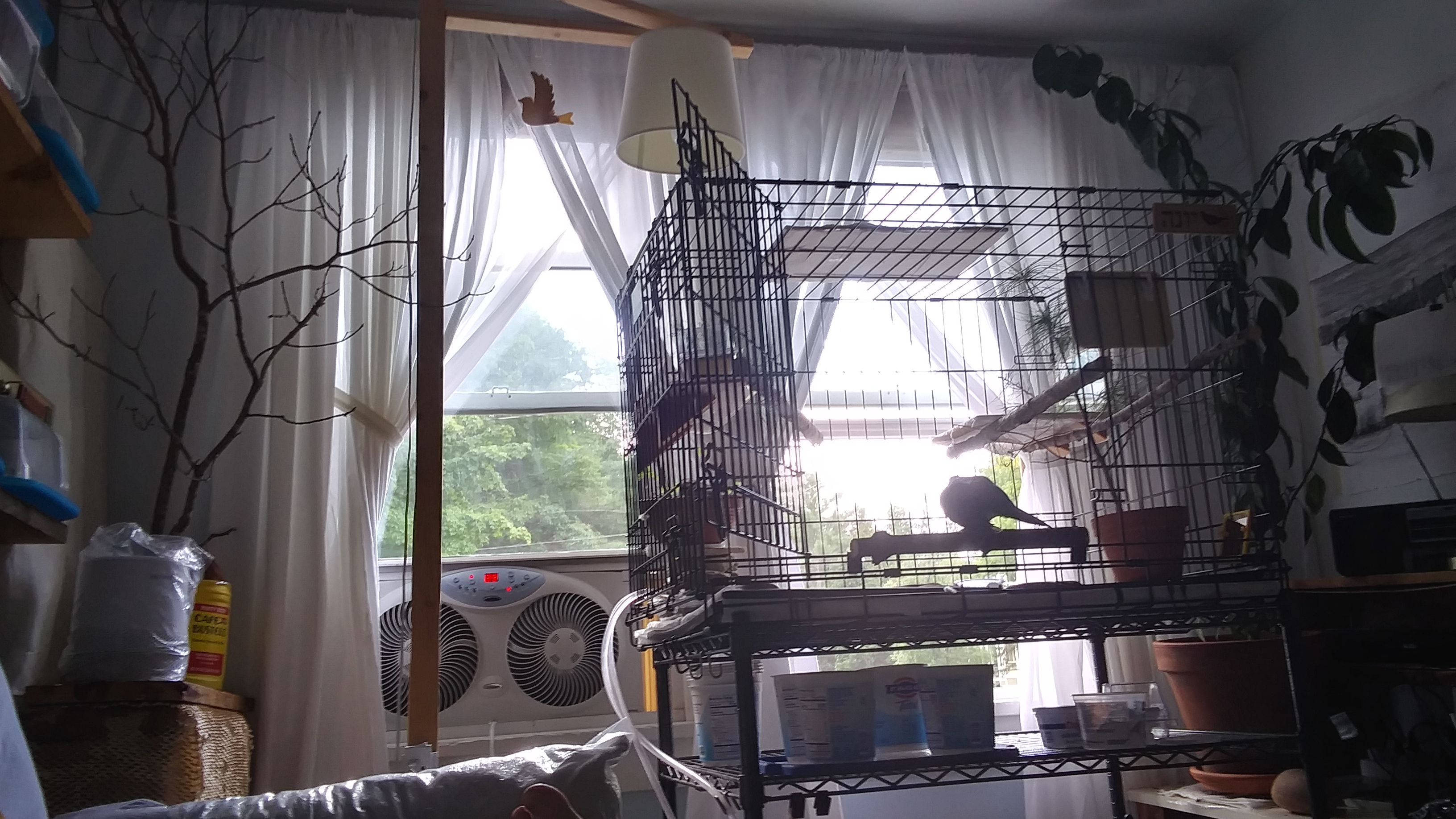 Well, to my PURE DELIGHT, at 5.18... "woo-HOO-hoo-hoo-hoo-hoo"! And when I replied, in kind, Yonah was in a bit of a "chatting" mood. All I could think was that he sensed my anxieties and was trying to tell me that I was being ridiculous about the worry. Still, the more we "chatted" as I opened his room and house for the day, the deeper my own agony burrowed. Being out of the house and away for so long was one thing, but being SO FAR AWAY... A HOUR DRIVE... well... But we got his door open, perches and platforms set-up, the curtains and blinds open. Last night, instead of his usual "night boards" to block the out-side light, I wanted something there, but didn't want to have to "roll" the shelves and Yonah's house about so early in the day, so I'd draped a couple of blankets over the top and down the "back" (window-side). The blankets were light enough to not put any extra weight on the shelves but "heavy" enough to block any street light or "head-lights" from any traffic out-side. And taking this down was really quite easy... all I had to do was roll it all up and removed the roll. And Yonah knew that this was "different"... he watched, so carefully, intently, as the fabric rose up, letting in the early morning light. He stood on the floor of his house, head tilted, just watching, until all was removed... at which point... all returned to a relatively normal sort of day.