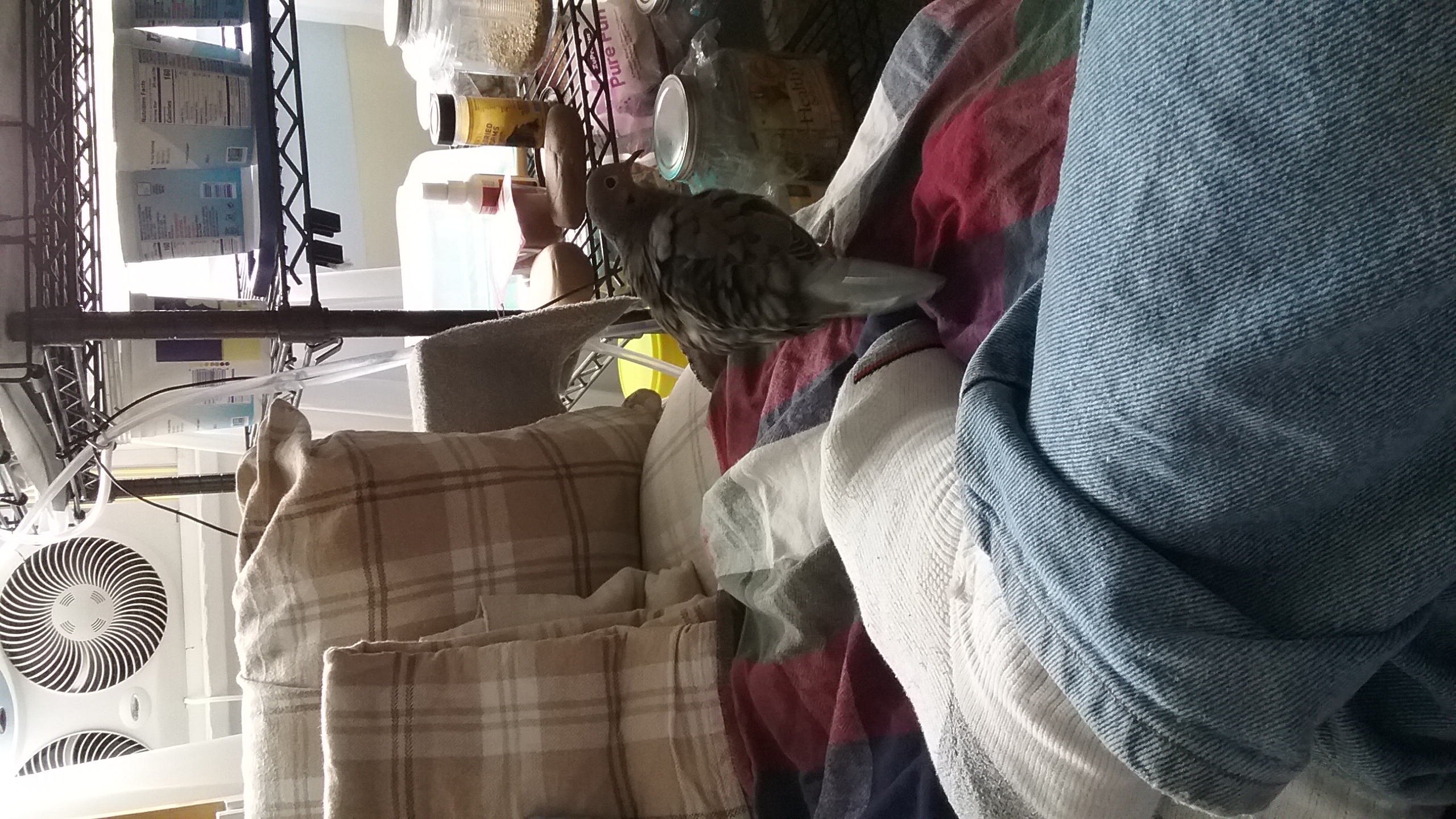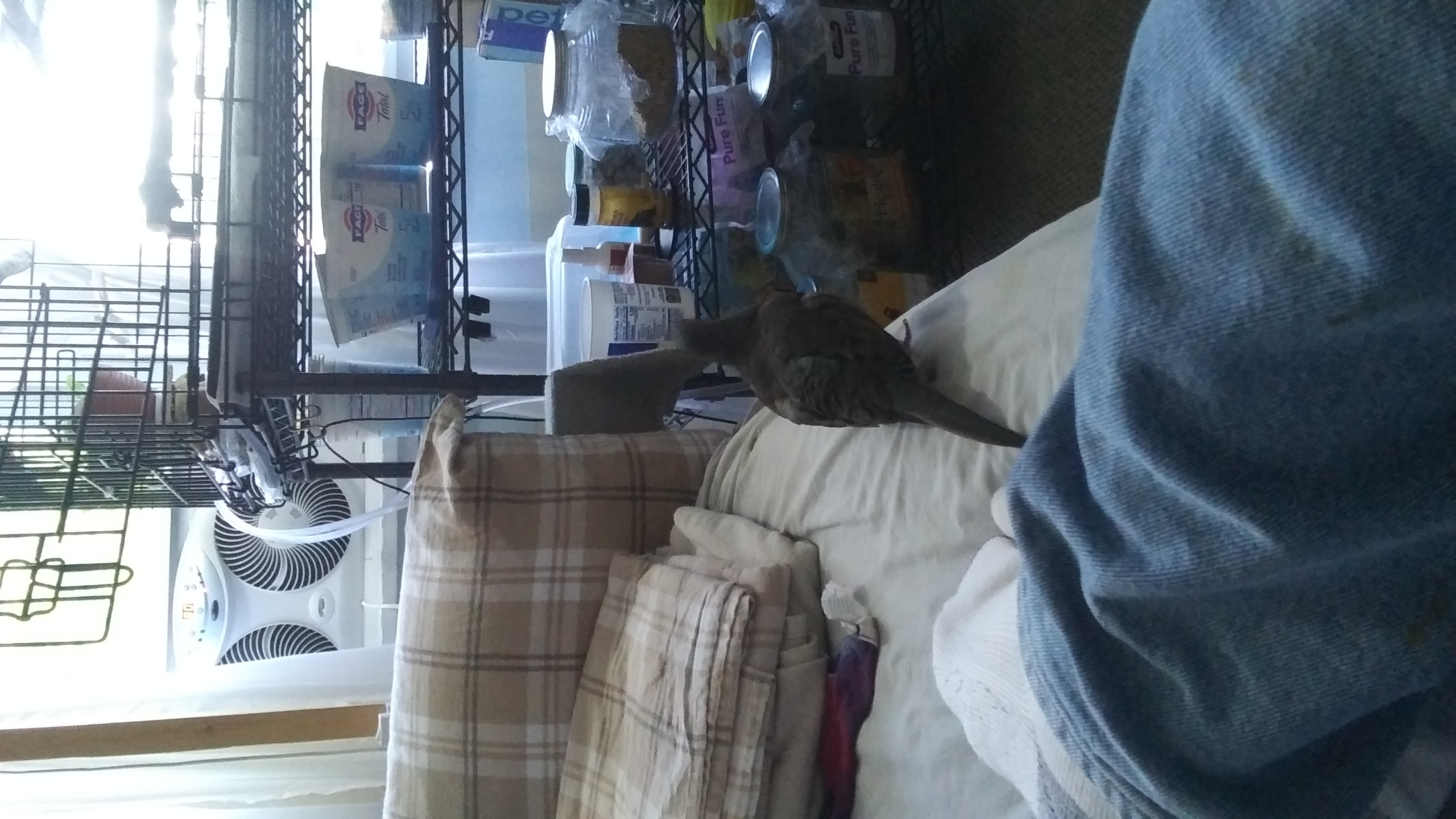 WELL... work done, I hurried back to the house and when I got back from work, I was SO WONDERFULLY GREETED as he hopped down to the door perch and gave me a few wing snaps! It's just a PURE DELIGHT to the heart to be so welcomed! I'll never know, with any certainty, whether or not he actually notices the time that I'm away, but, apparently, there's some degree of awareness that I'm not in the house or near for a period of time and when I'm finally back, he's really happy that "our flock" is back together. MANY KISSES, and cuddles and I changed into "house clothes", went back to Yonah's room and we had a little "mid-day snack" together. We picked-up from where we'd left-off this morning, as if my time away had never happened. And it was SO obvious that Yonah was happy to know that I was back... and, to be certain, I was happy to be back with him.