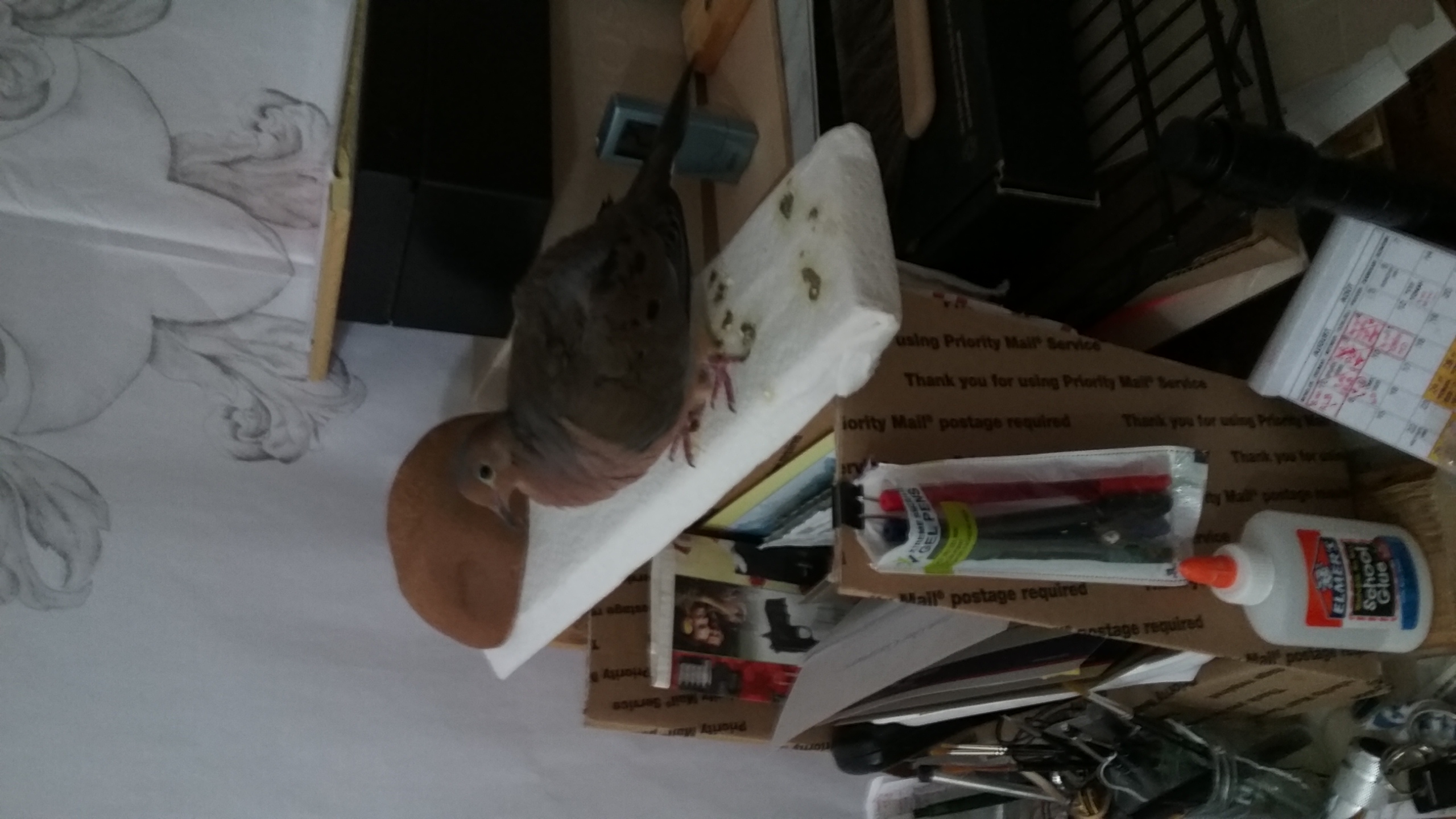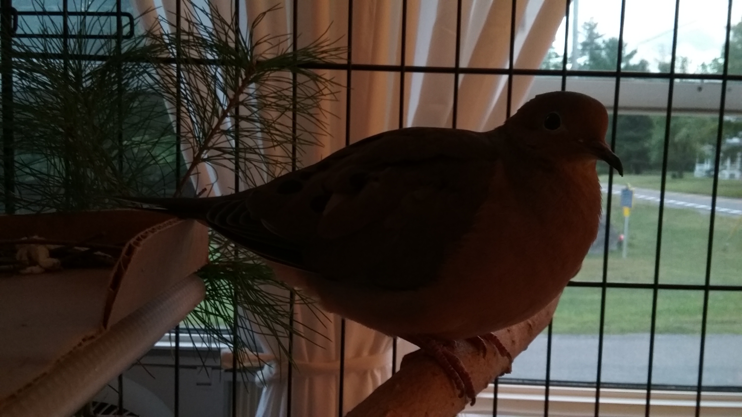 One thing though, that I particularly noticed this evening: The Yardies came round, as they do, and the mourning doves came by for their evening meal and I'm REALLY noticing how much darker Yonah's feathers are, compared to theirs. The doves out-side are various shades of "beige", over-all, and Yonah's feathers are shades of "brown" and very noticeably darker. I've read that dark-colours can be a sign of "liver" troubles. (As a matter of fact, I'm reading several sources that say that birds who are "granivores", whose diet consists, primarily of seeds, tend to have a lot of "liver" troubles... I'm concerned now, but, I know that Yonah gets a bit of variety in his diet... with the pellets of the "ZuPreem Pure Fun"... with little fruit and vegetable pellets. Still, I have to wonder if it's actually "enough".) Anyway, thankfully, we have an appointment come Thursday. The veterinarian will tell me whether or not I ought to "worry".
