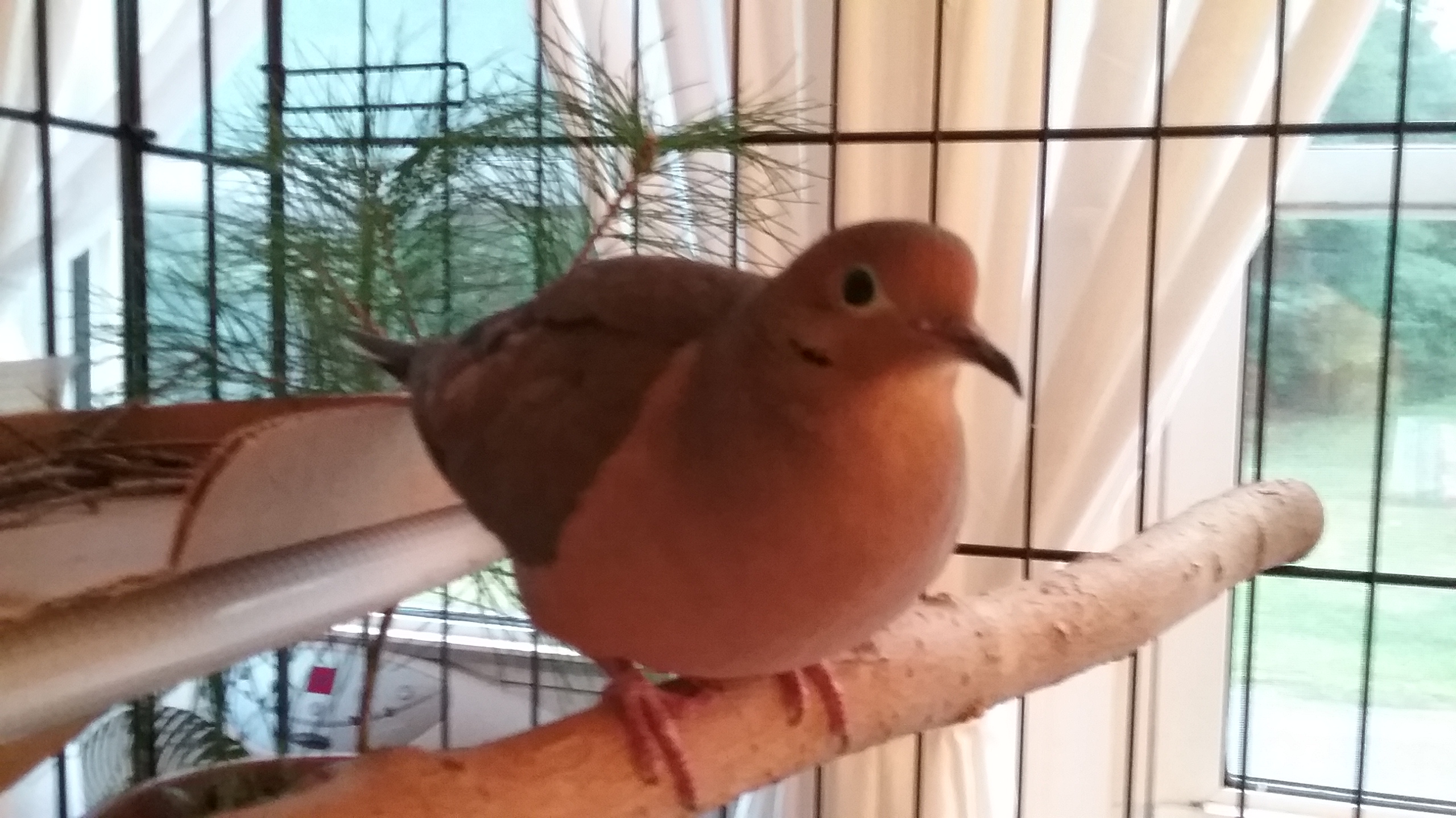 I can't help but notice how the mourning doves out-side will coo, back and forth and Yonah hears them but only seldom does he ever even acknowledge their calls. He has a "perch" attached to the back screen door so he could "roost" there to "visit" or, at least "chat" with them. But he really shows no interest. He's obviously quite comfortable being in HIS house, on HIS perch, in HIS room... and he's quite cozy under his little "private sun"... his UV light. Well, at least he's getting the "UV" that he needs now too. It's not "natural sun-light", but (hopefully), it's providing him with his essential necessity.
